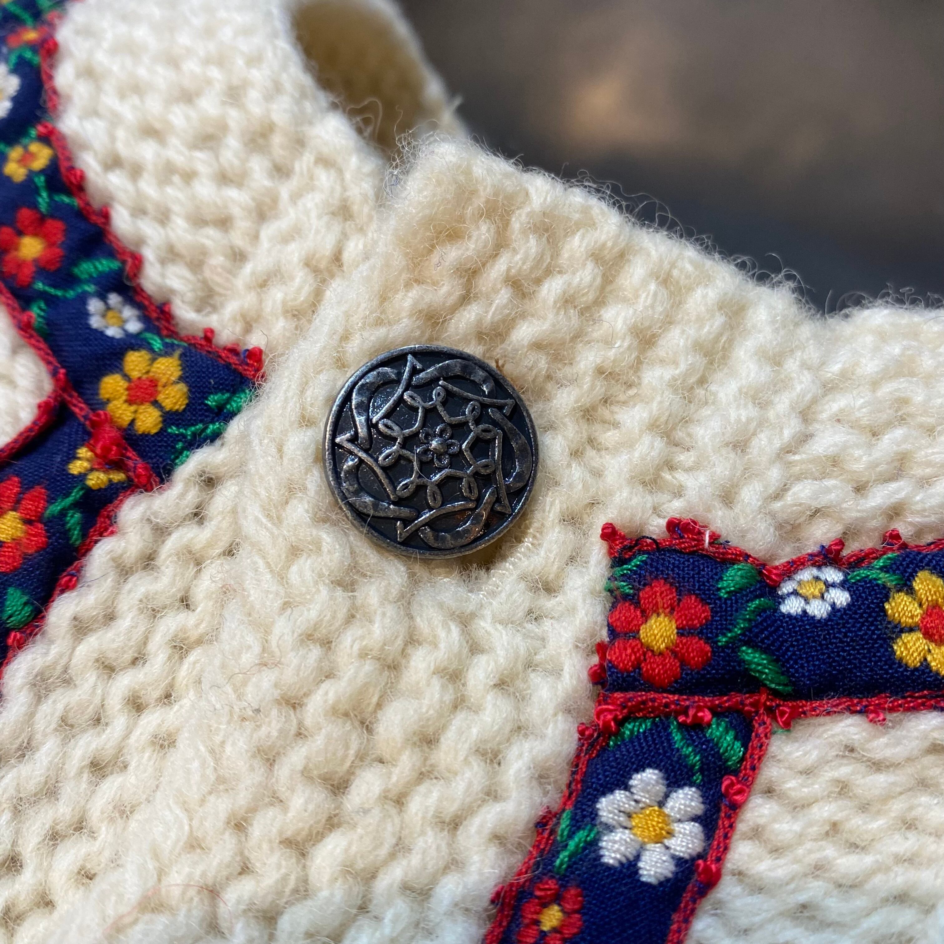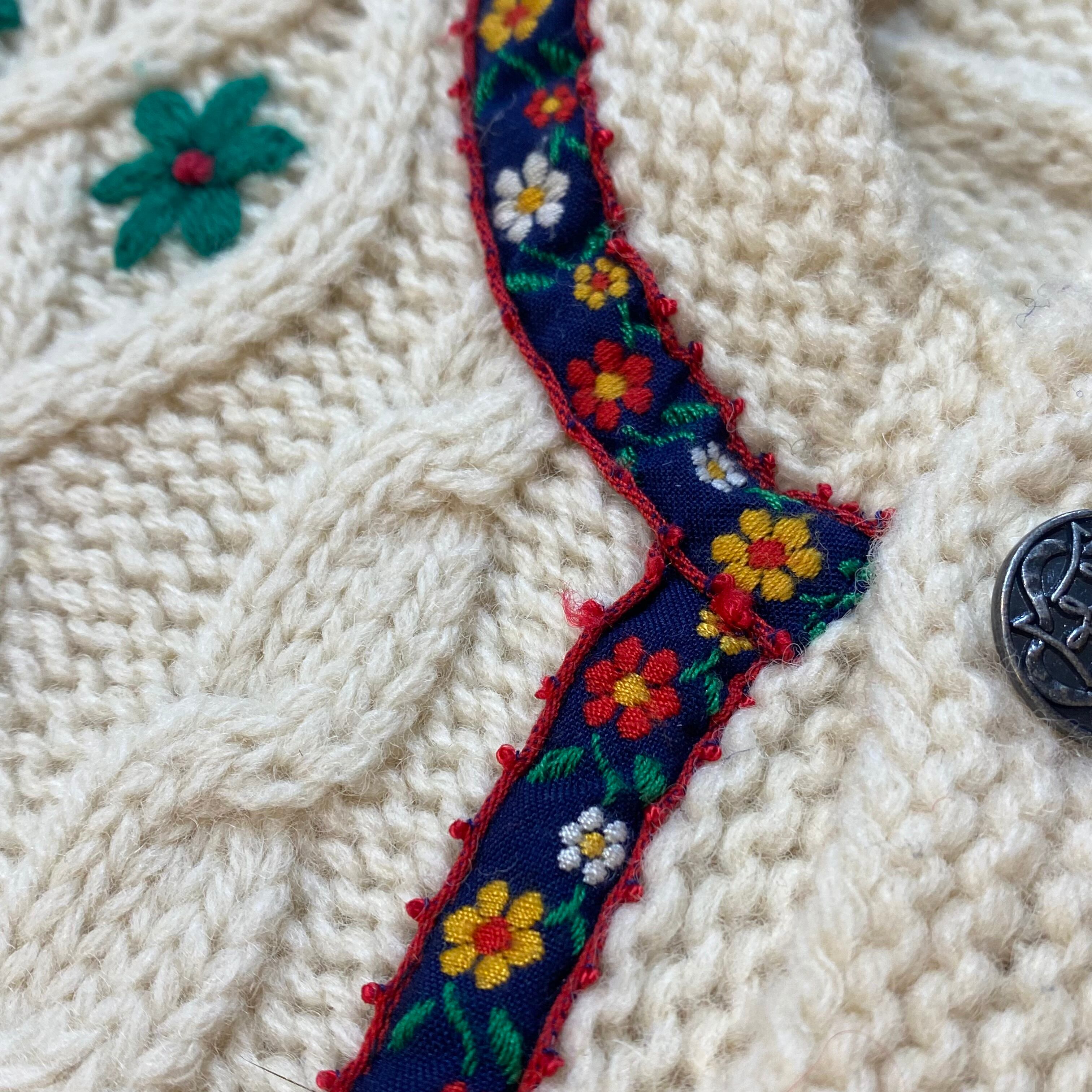 お花の刺繍とチロルテープが可愛い、ニットカーディガンです。