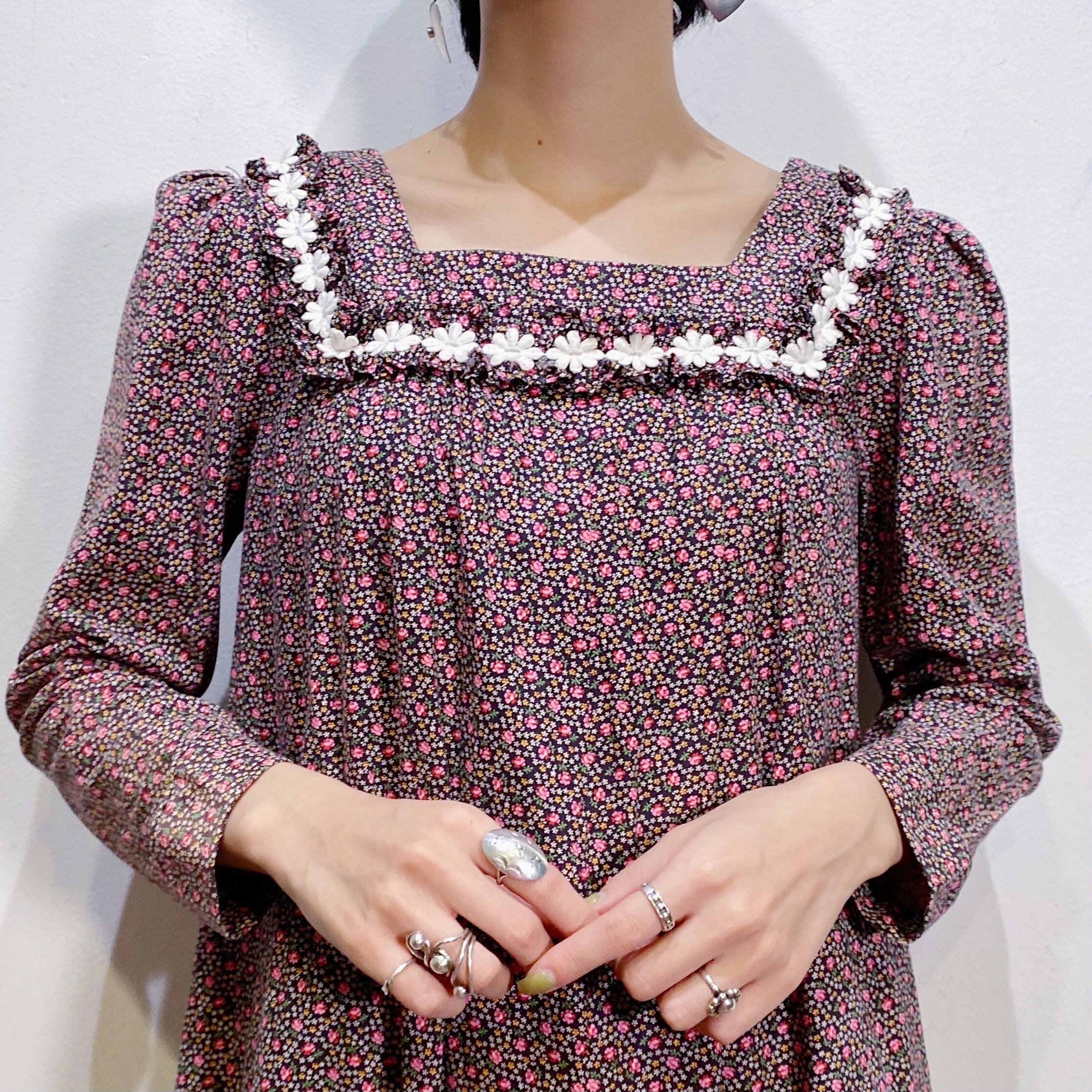 ブラックベースの小花柄が大人可愛い、70年代のワンピースです。
