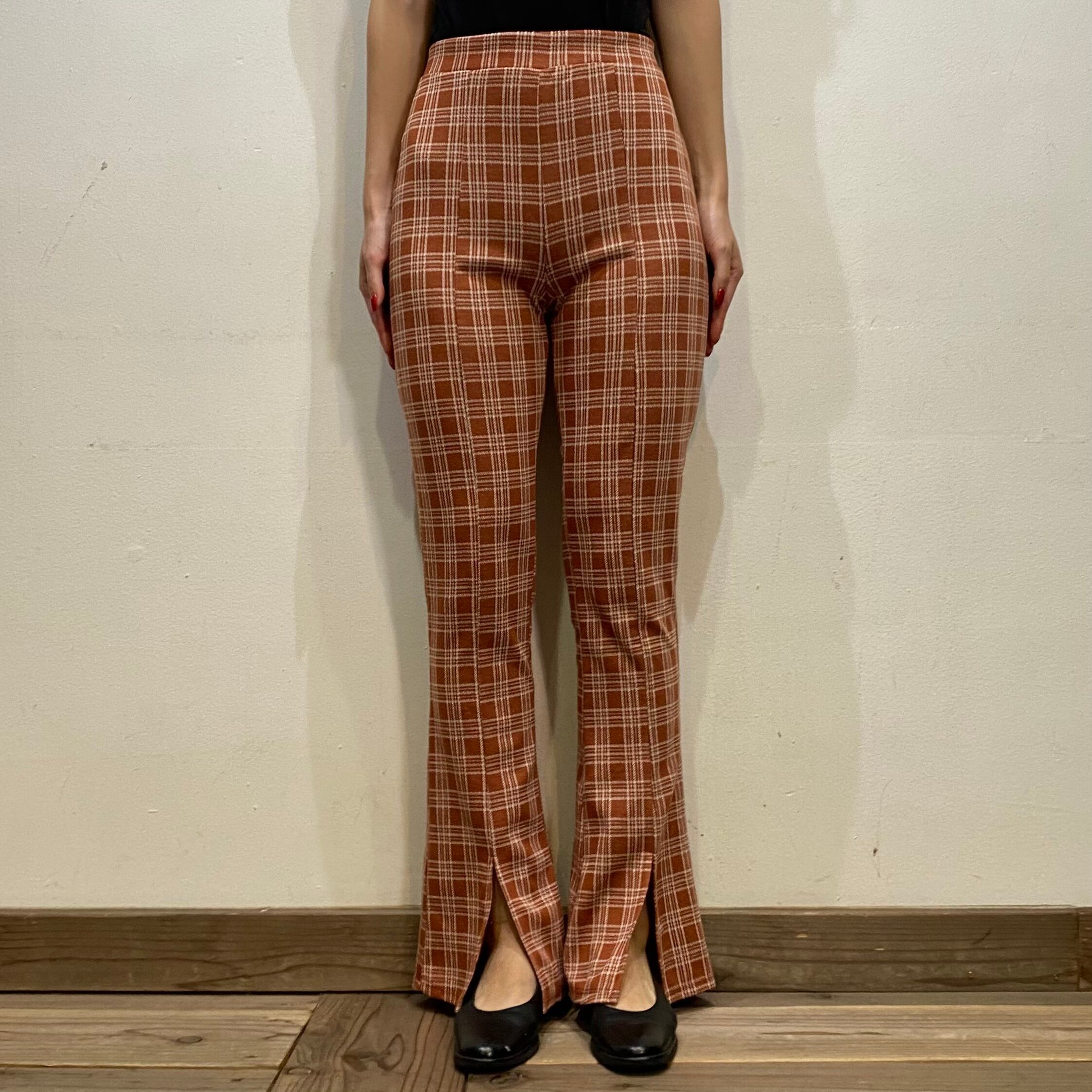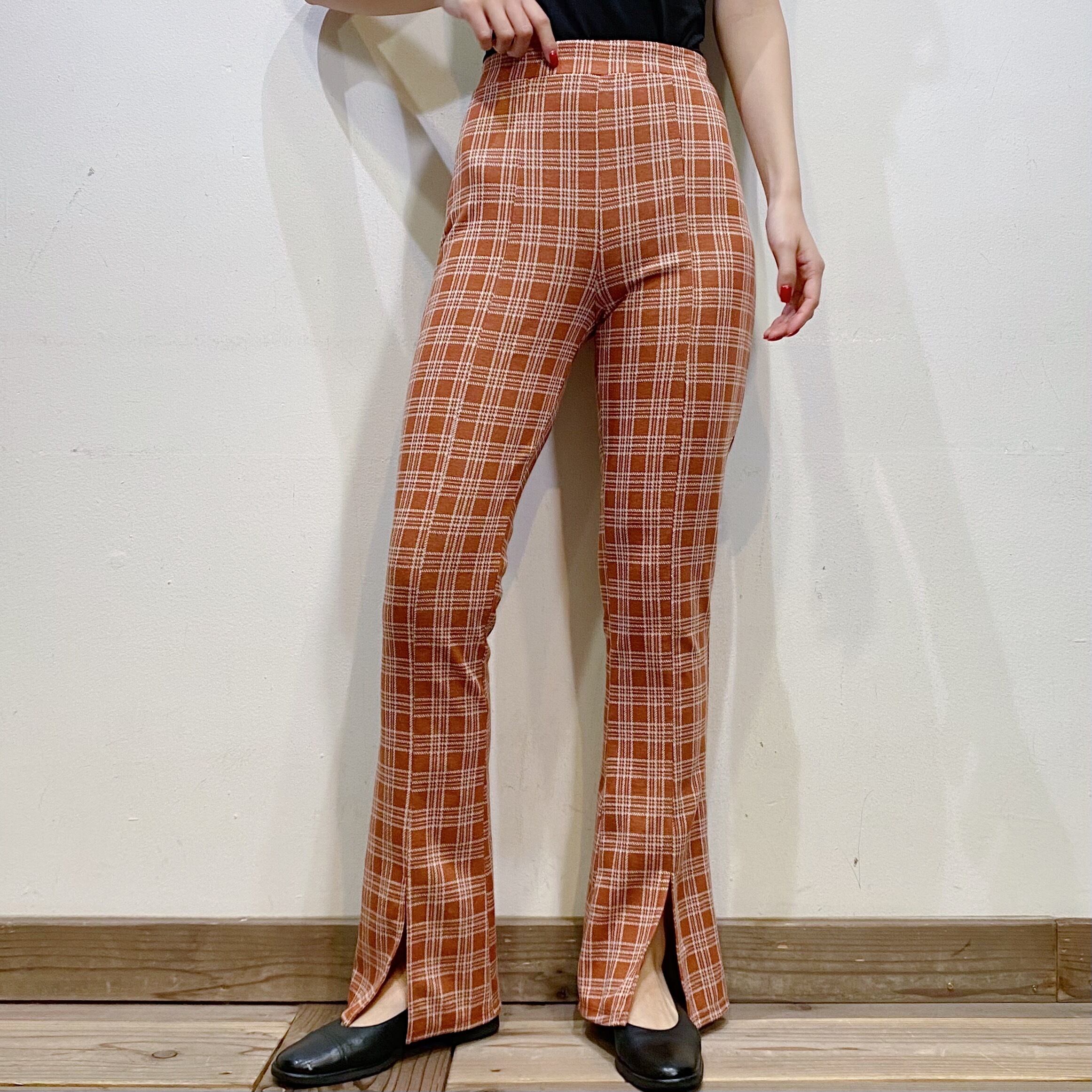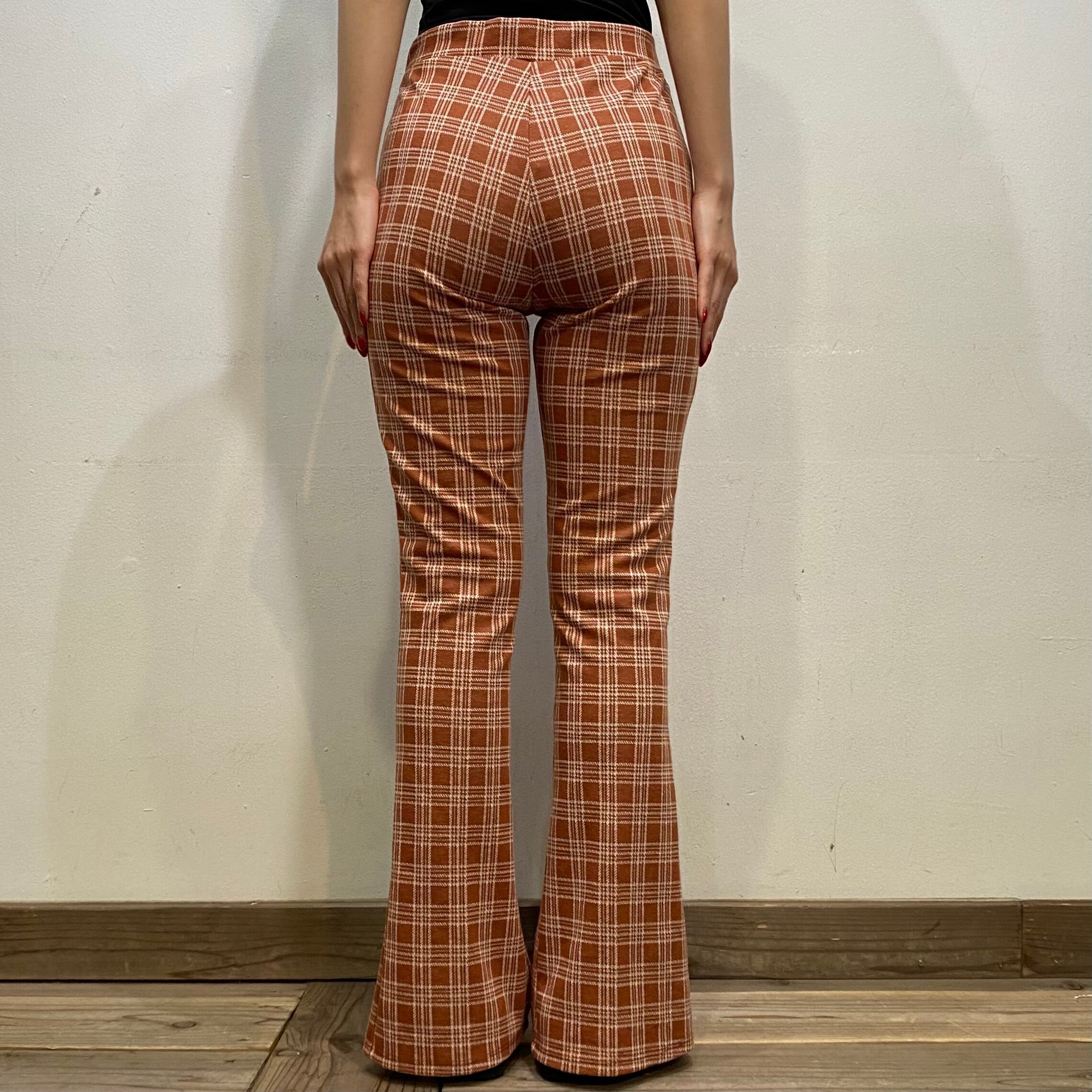 オレンジとブラウンの中間のような絶妙な色合いが可愛い、チェックパンツです。