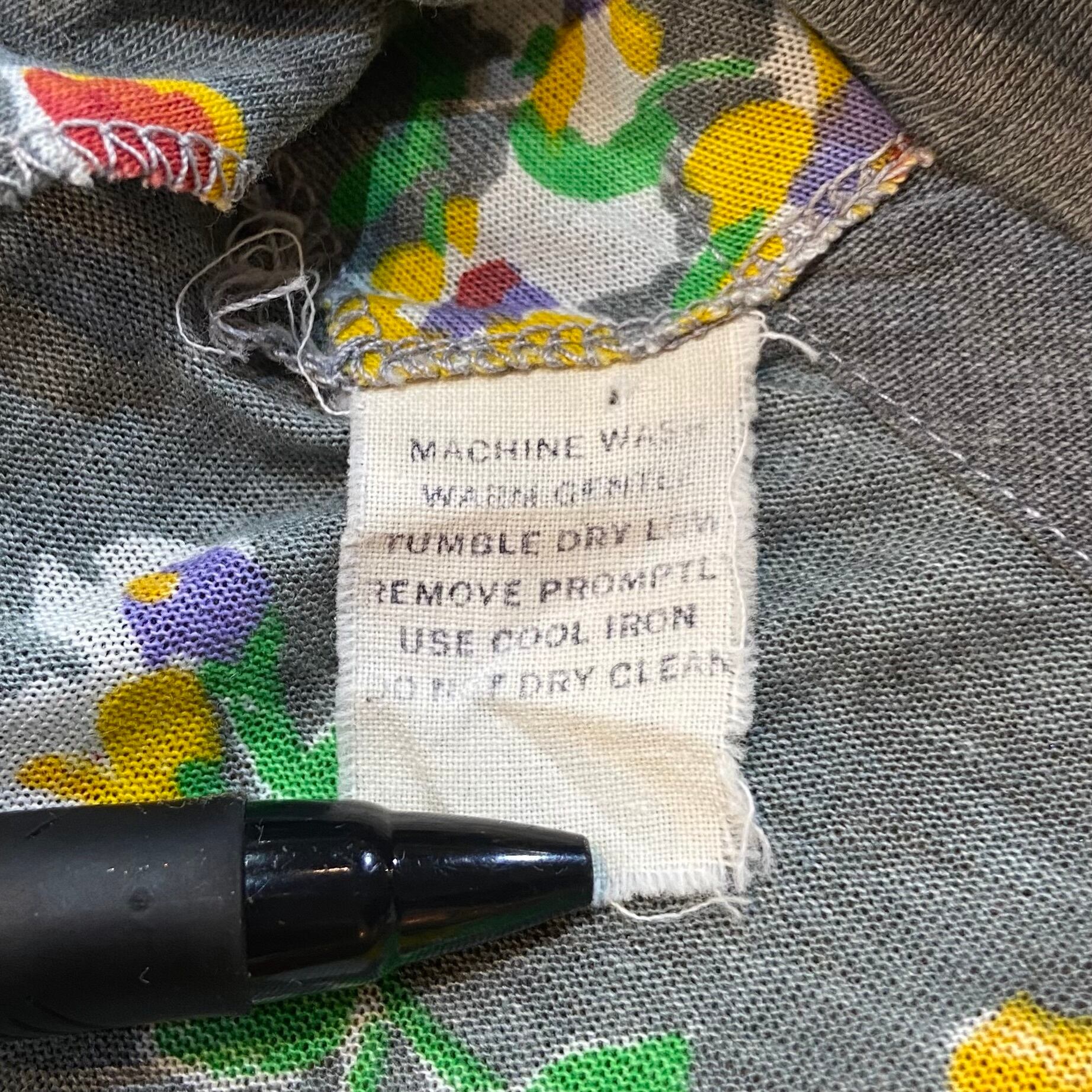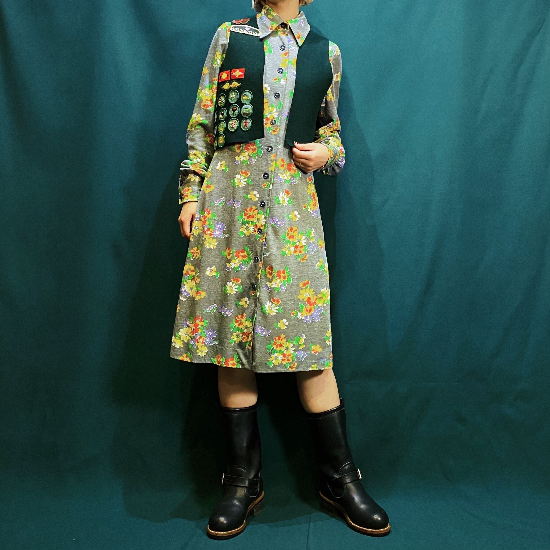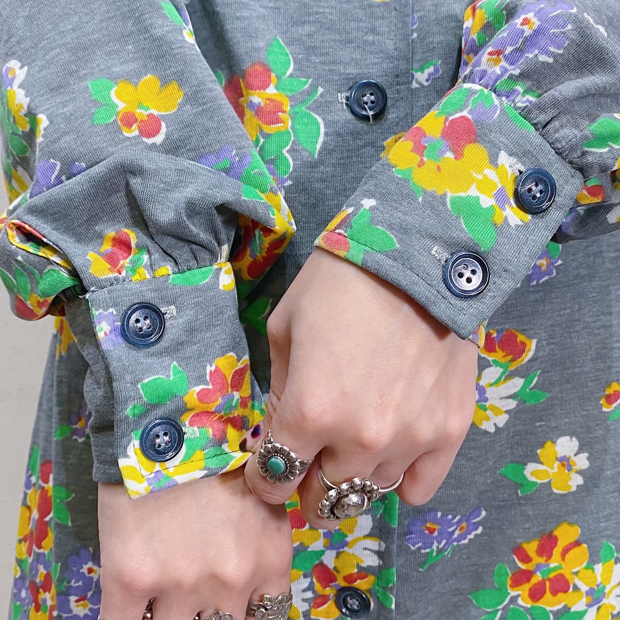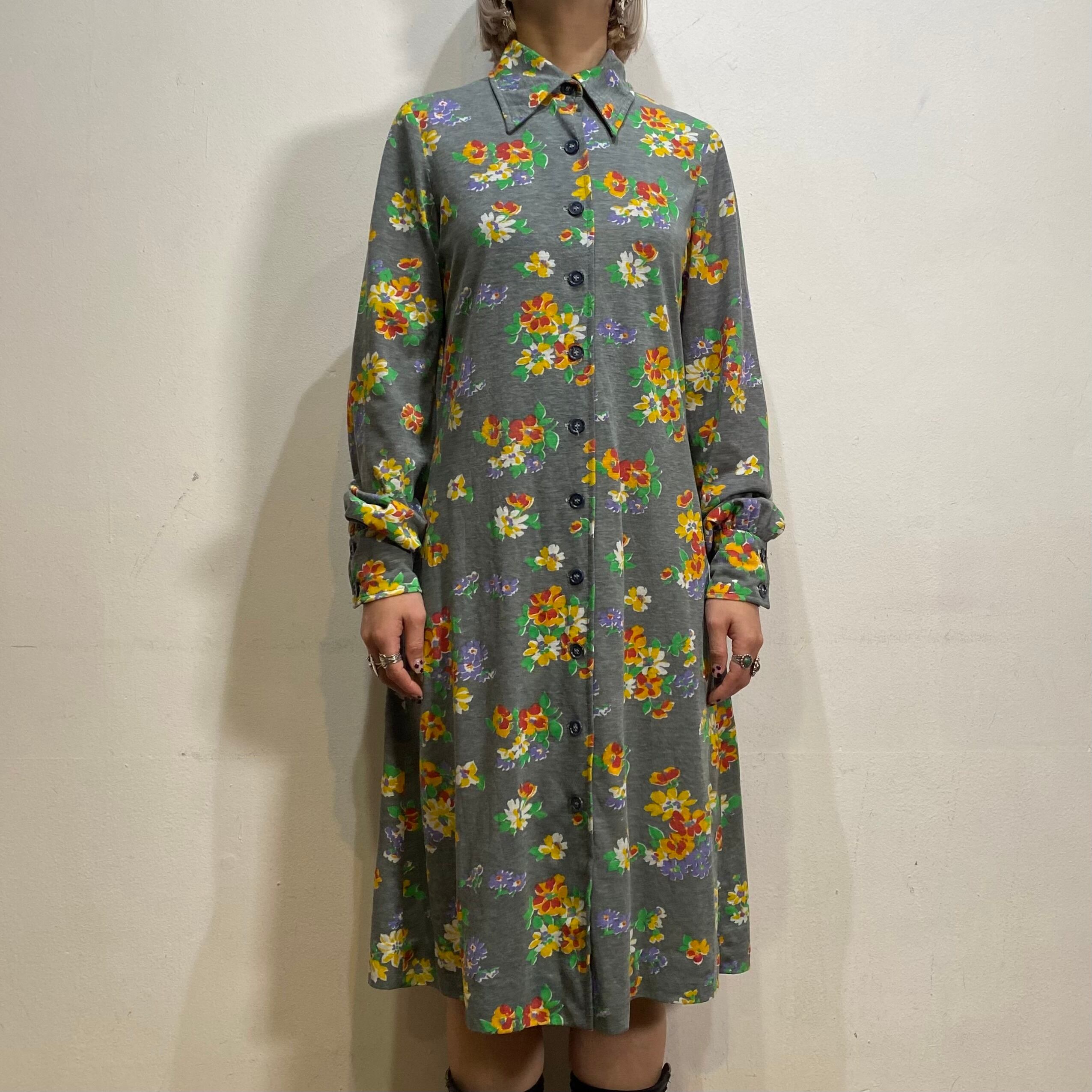グレーカラーベースにイエローやパープルのお花柄が可愛い。70年代のシャツワンピースです。