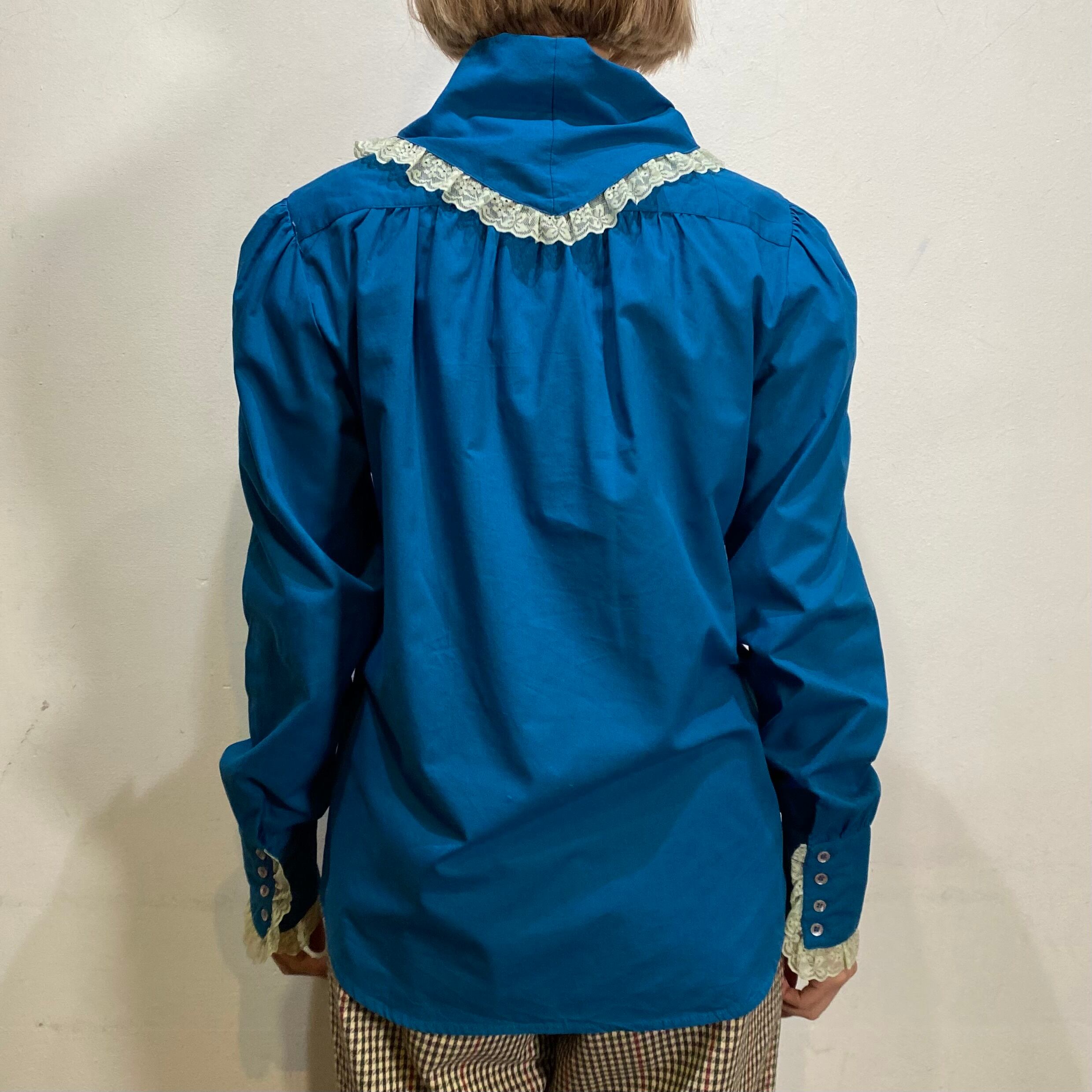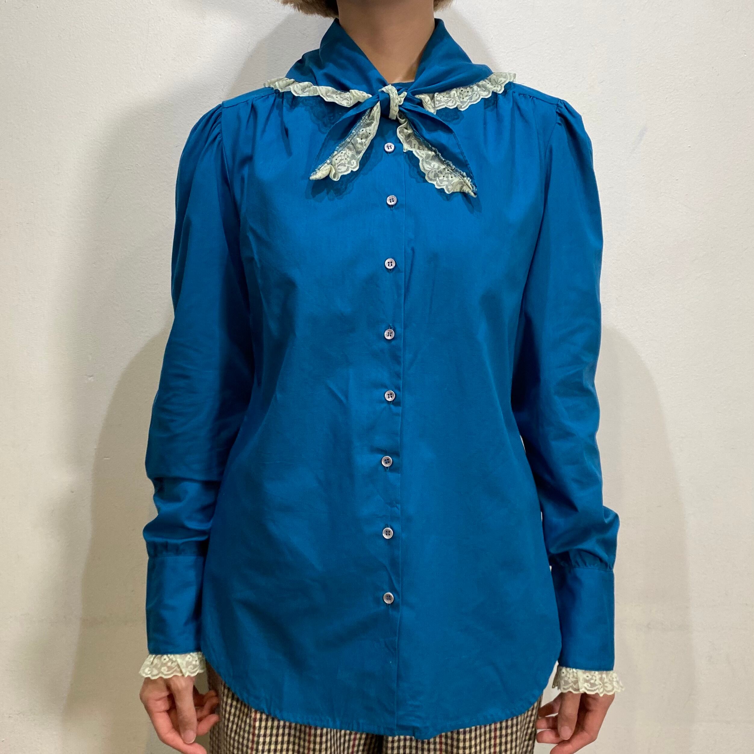 襟のようになったレース付きのリボンタイがとても可愛い、80年代のブラウスです。