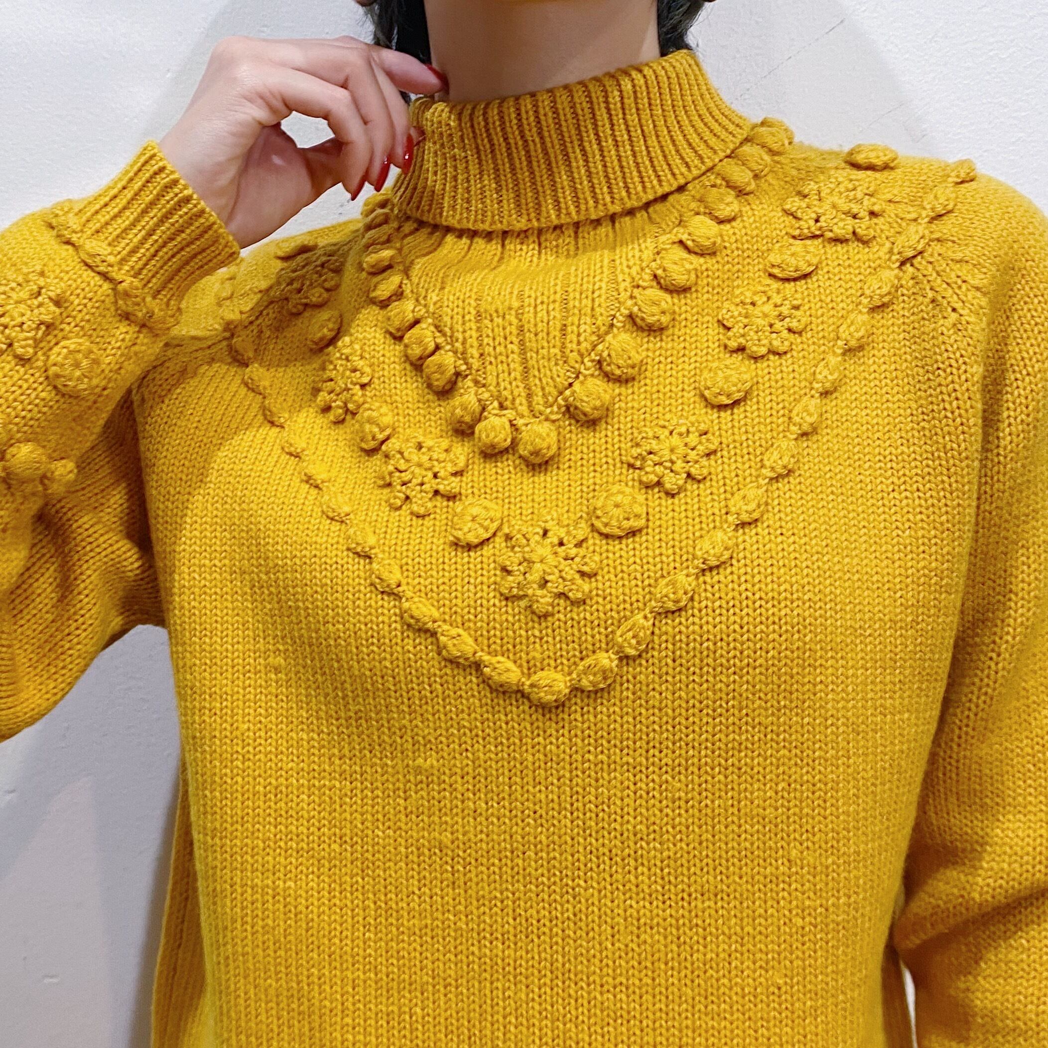 ポンポンとお花モチーフの編み模様がとっても可愛い、70年代のニットセーターです。