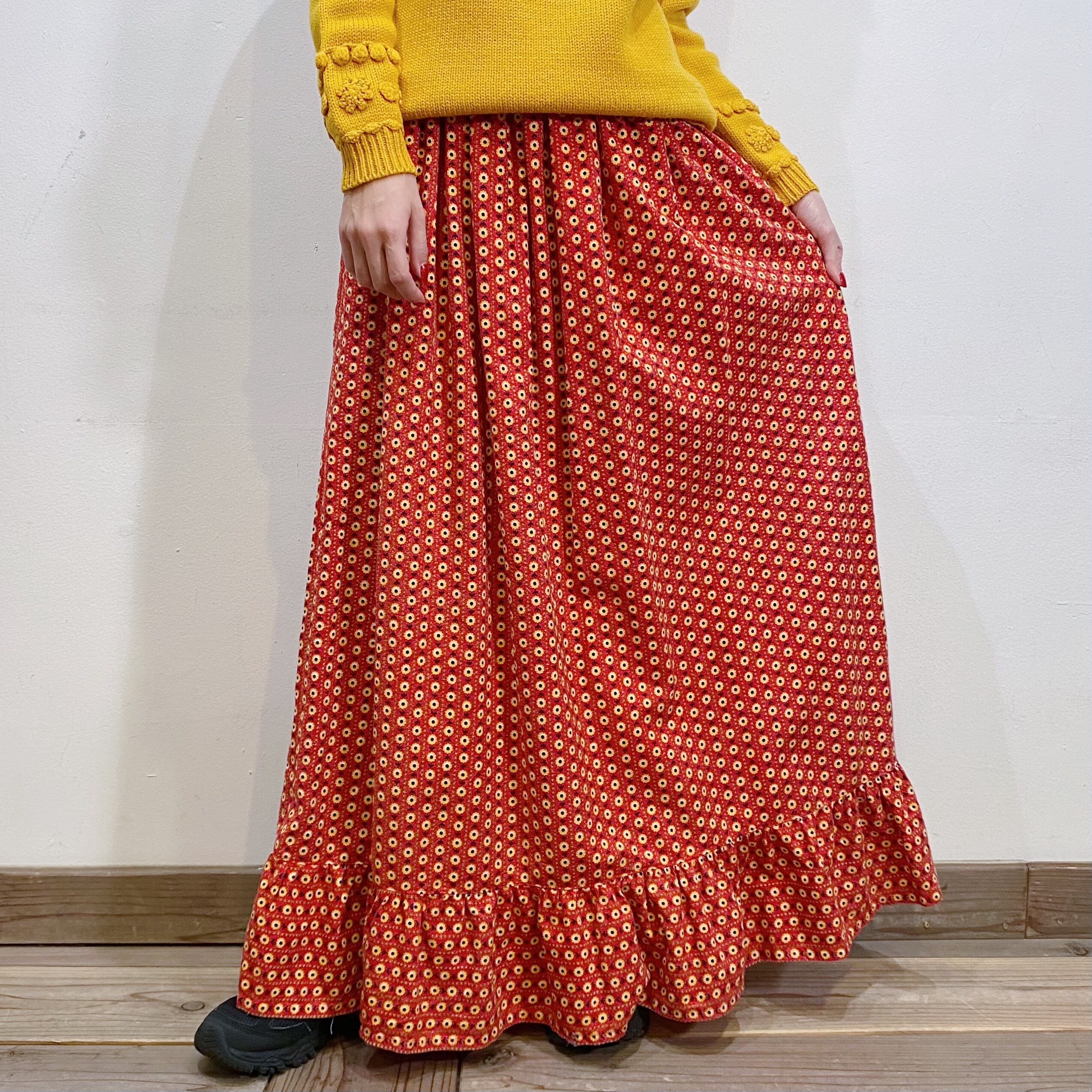 小さなお花とドットのストライプ柄が可愛い、70年代のロングスカートです。
