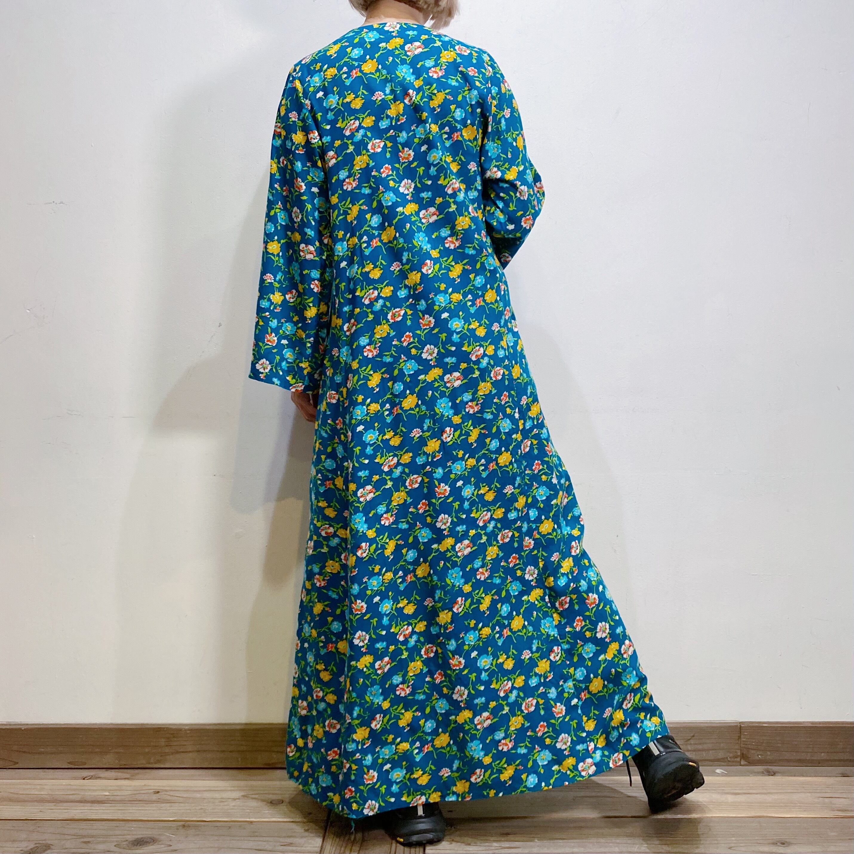 華やかな色合いの花柄がとても可愛い70年代のロングワンピースです。