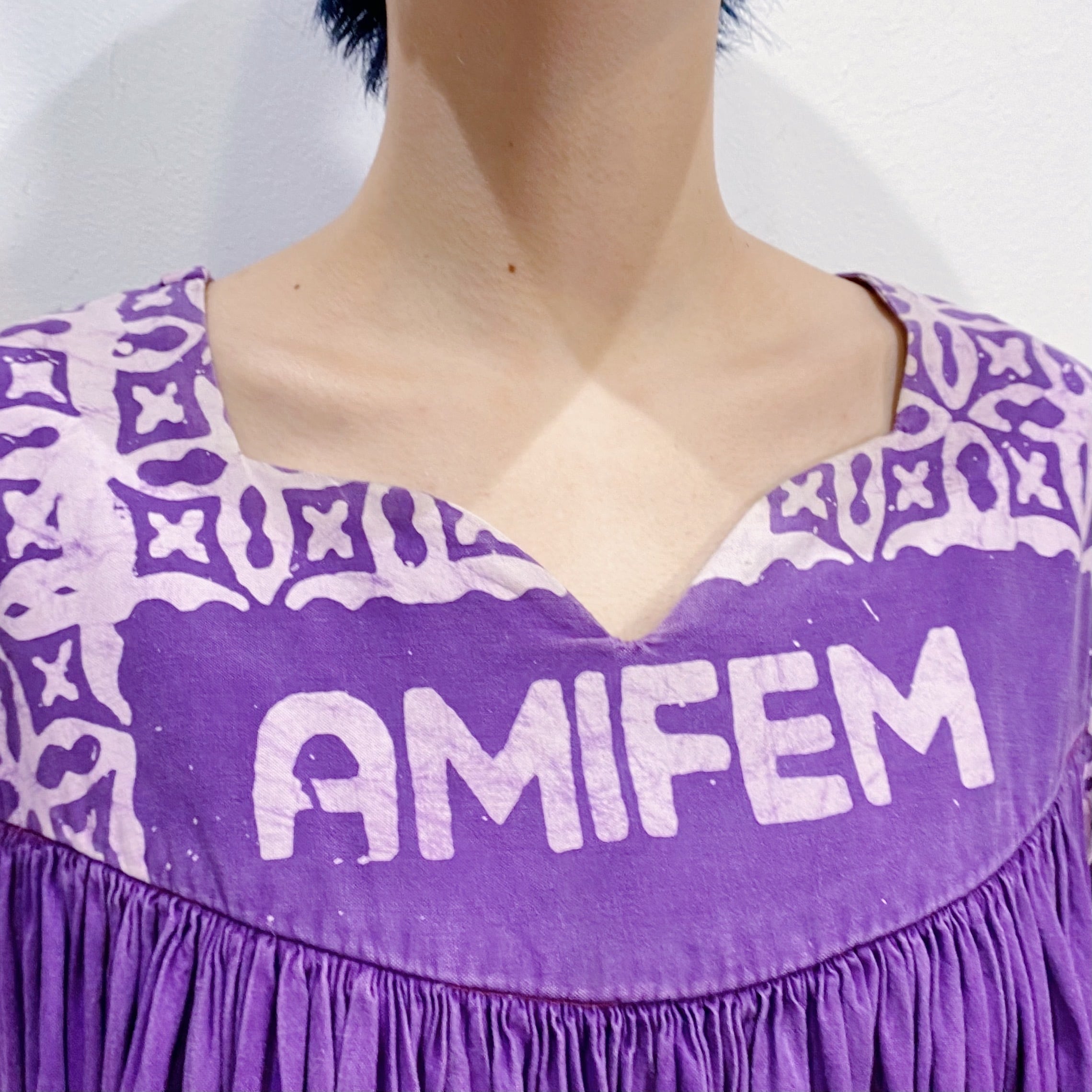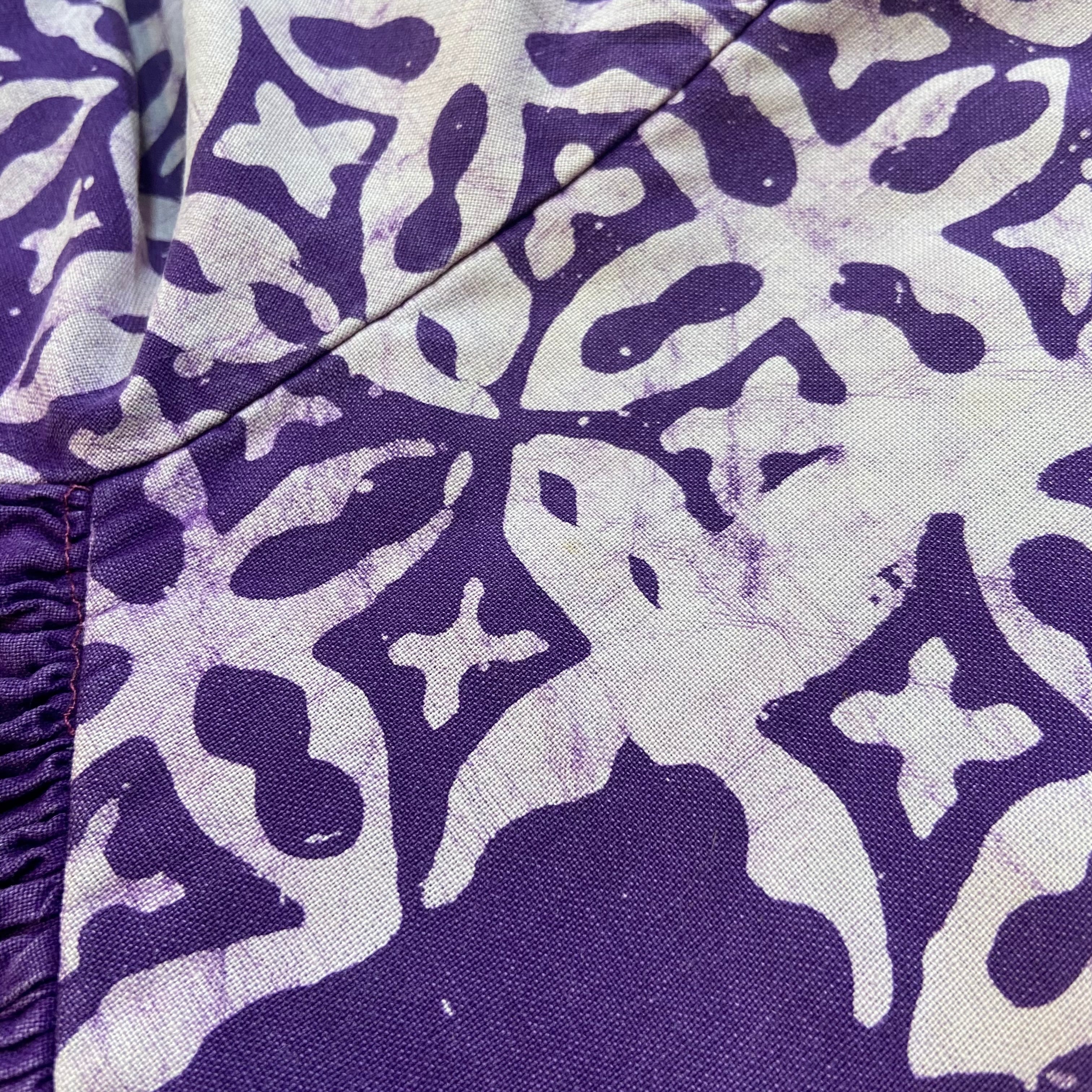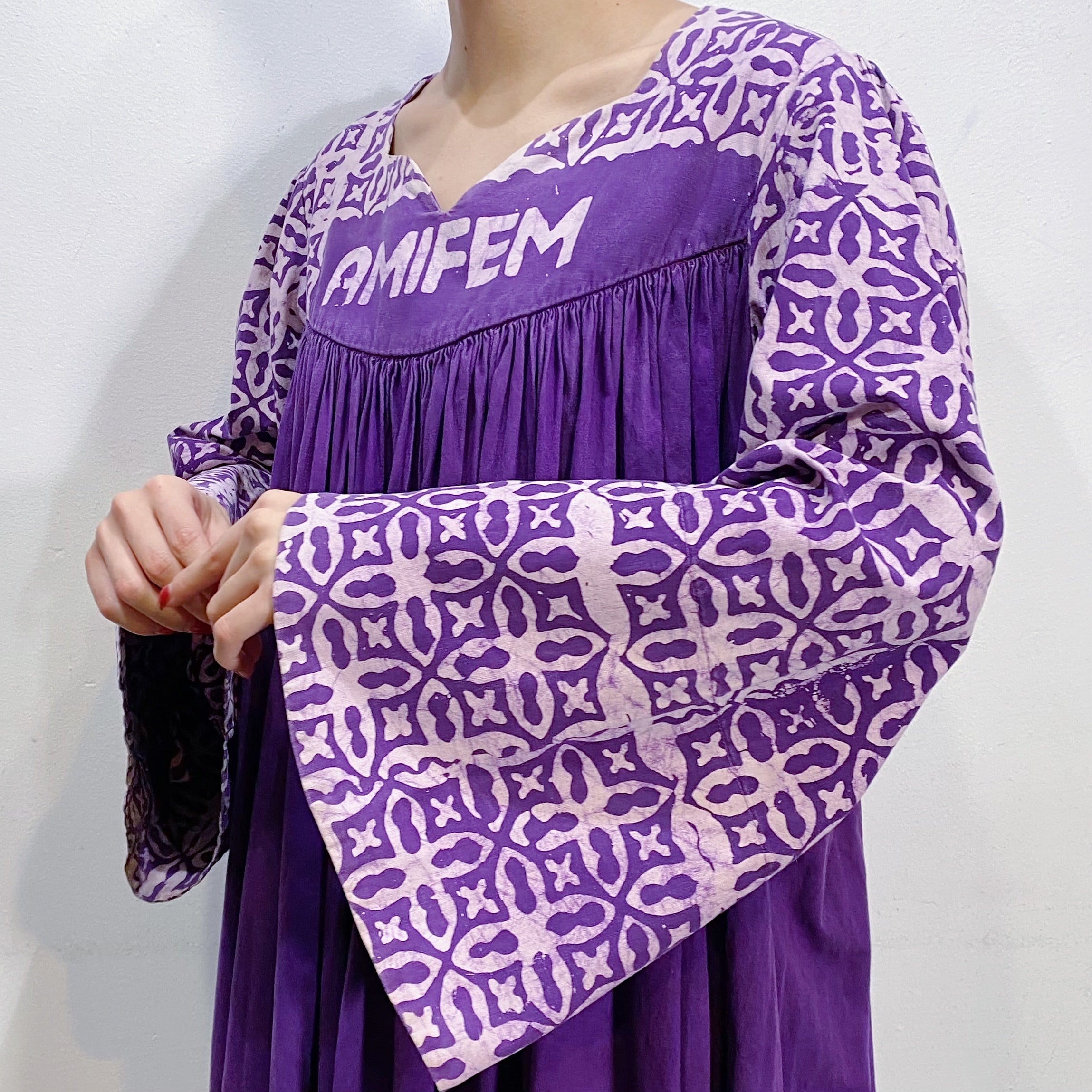 パープルベースに天秤やタイルのようなプリントが素敵な70年代のロングワンピースです。