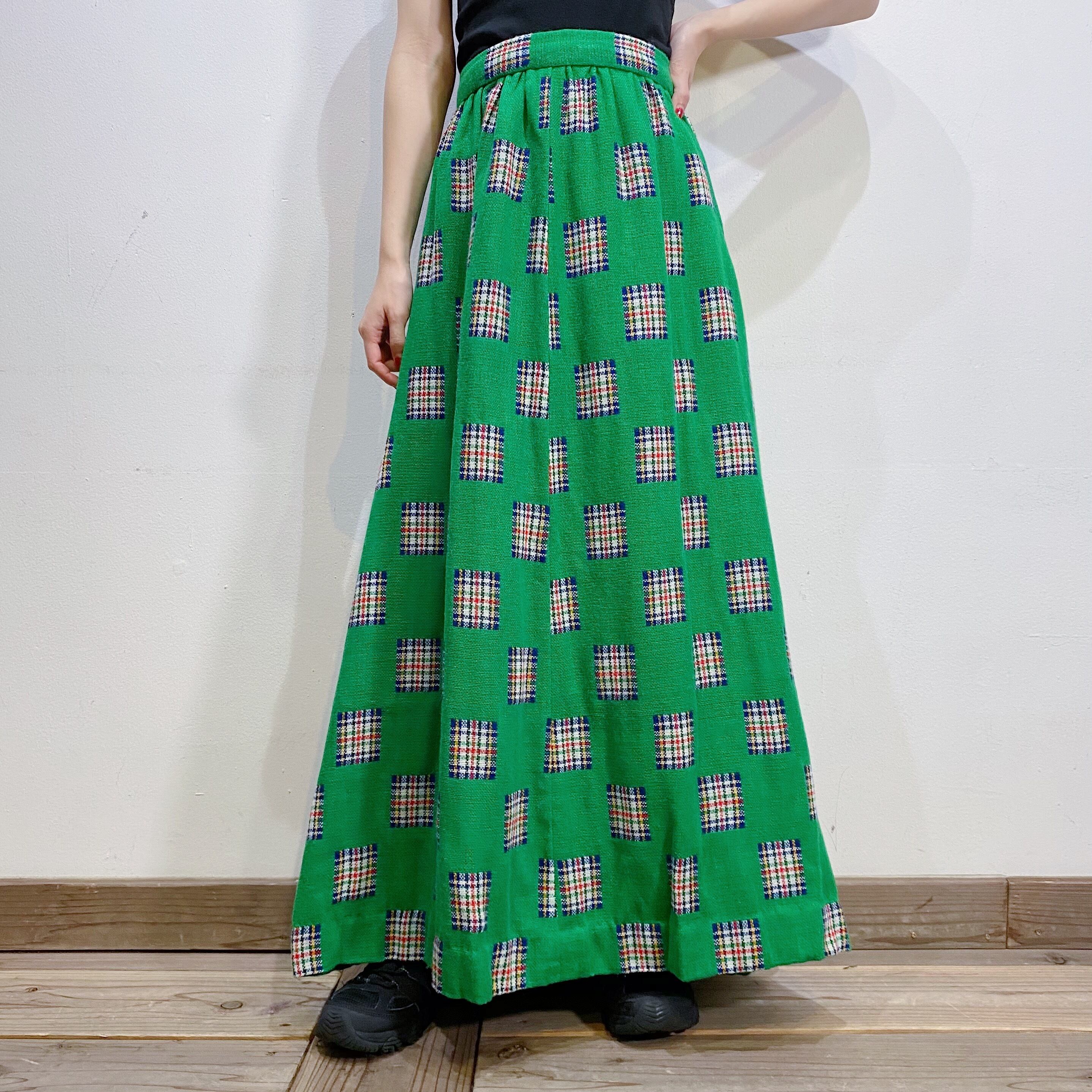 鮮やかなグリーンに小さなチェックの四角い小窓が付いたようなデザインが可愛い、60~70年代のウールスカートです。