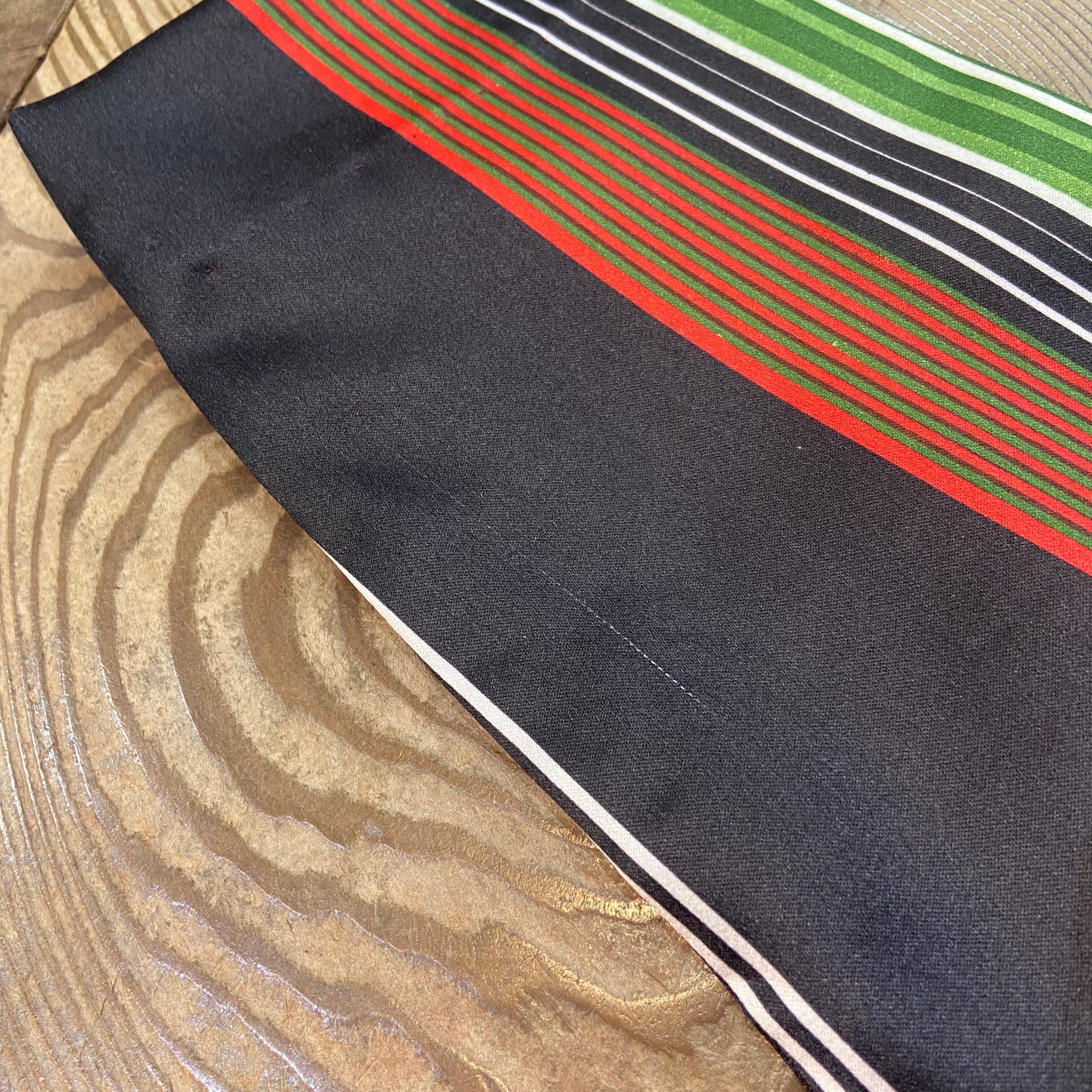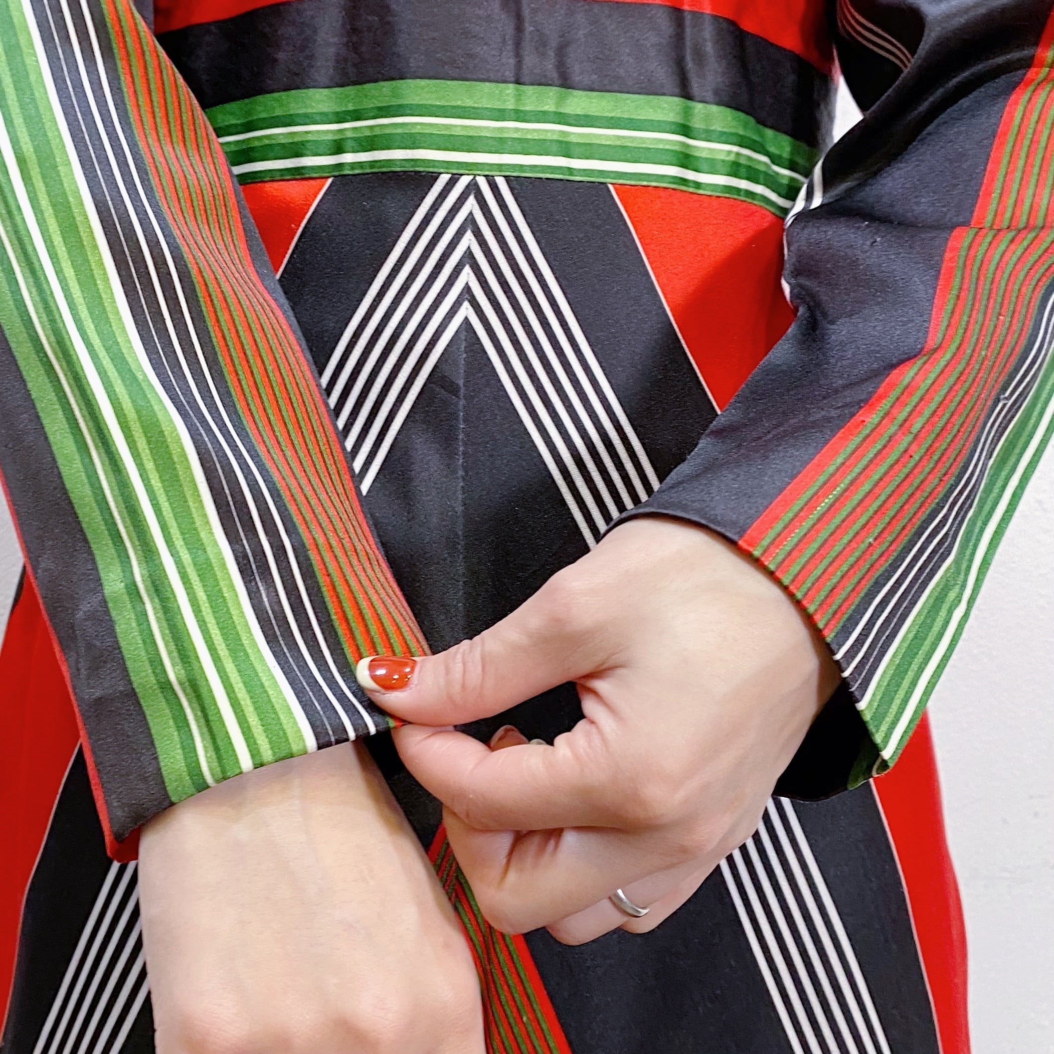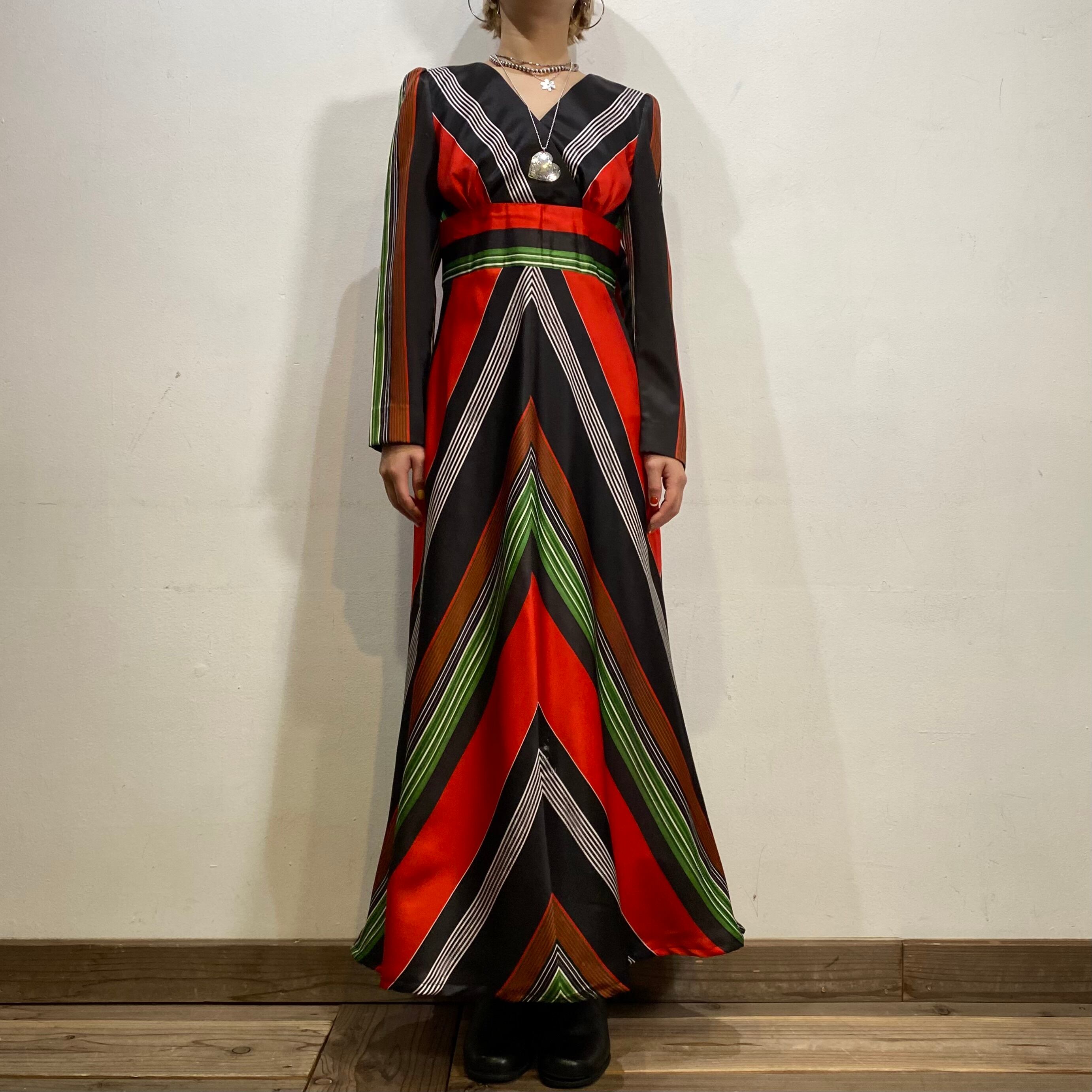 ブラックベースにレッドやグリーンのストライプ柄が映える、60~70年代のロングワンピースです。