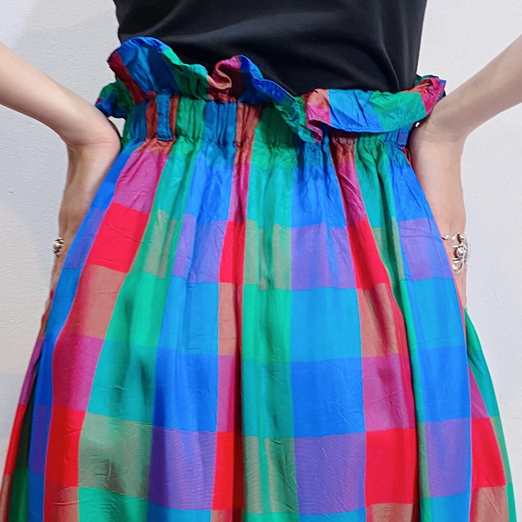 程よい光沢感とハリのあるシャンタン素材に青×赤×緑のチェックが可愛い、60年代のスカートです。