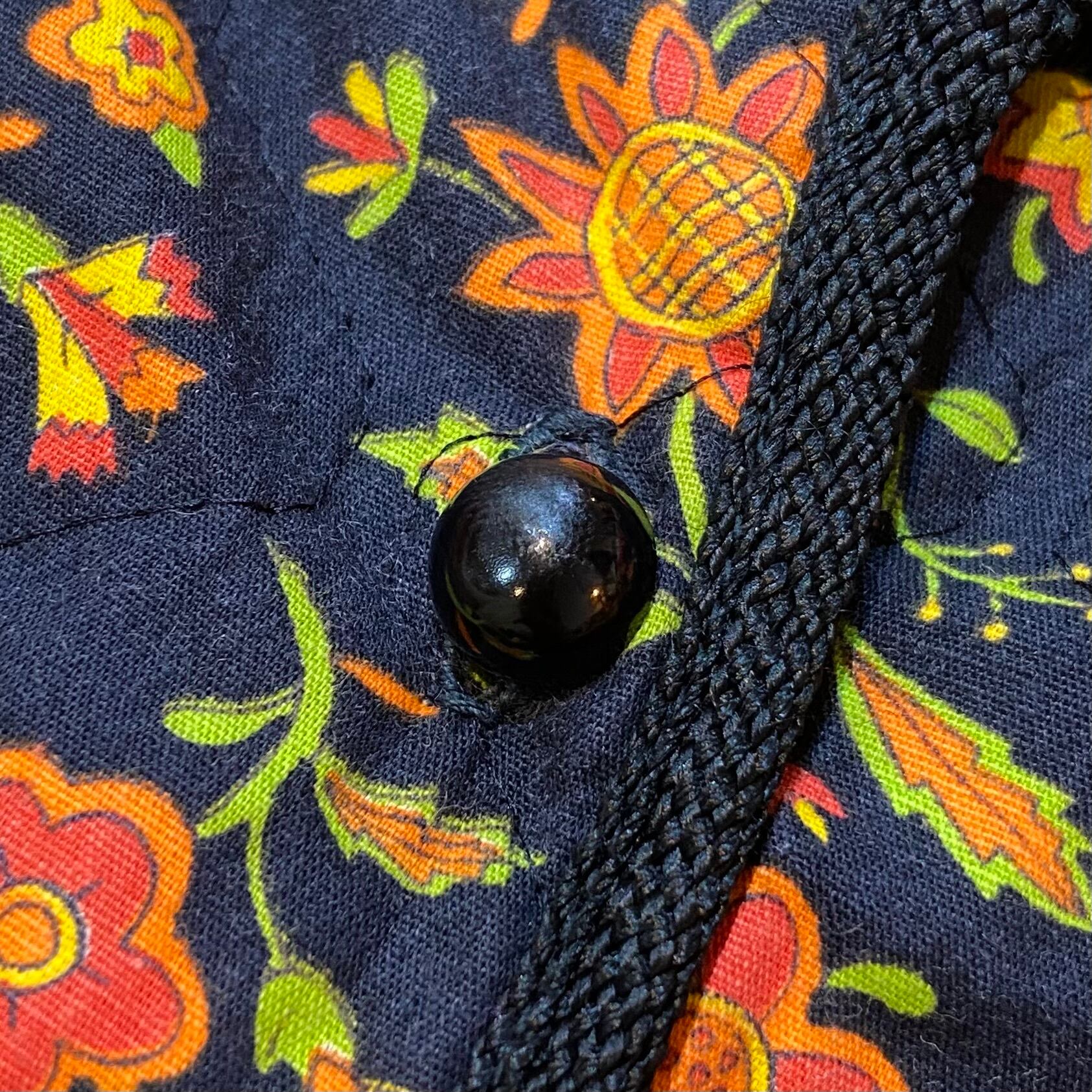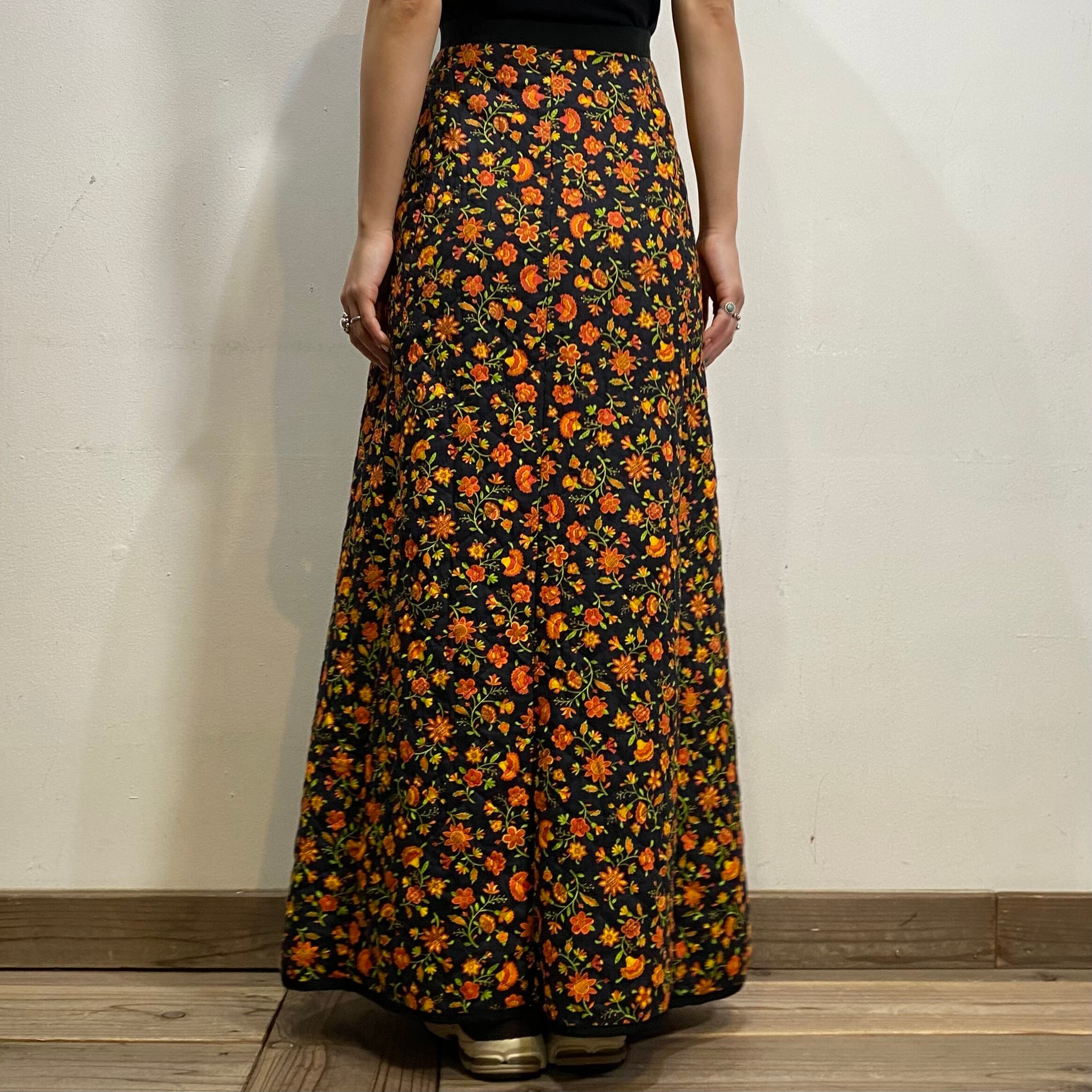 オレンジとイエローカラーのハッピーな花柄がとっても可愛い、70年代のキルティングロングスカートです。