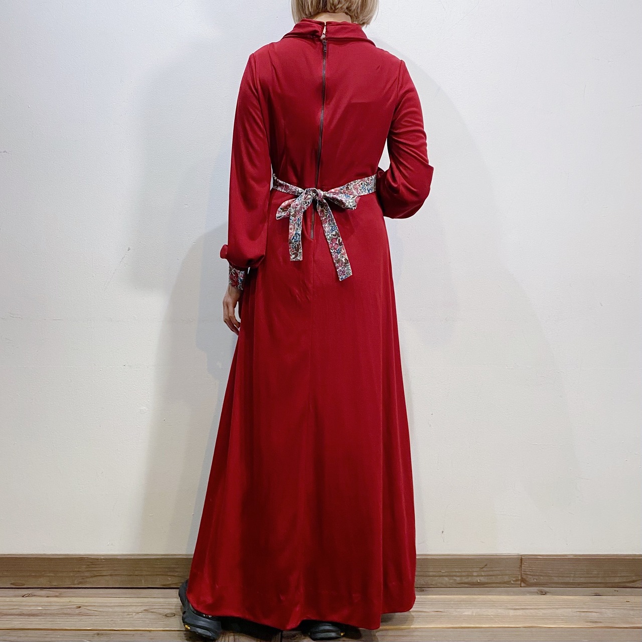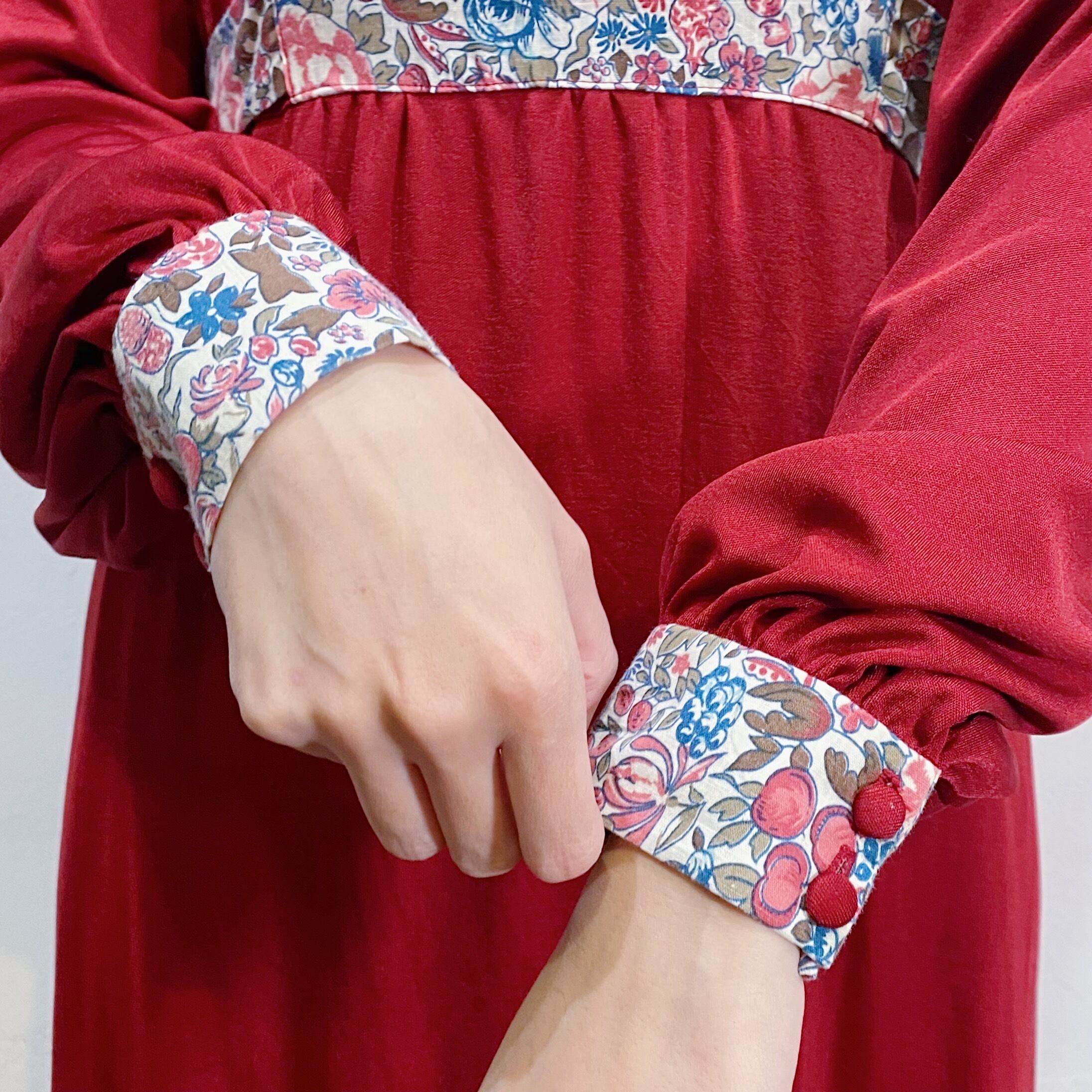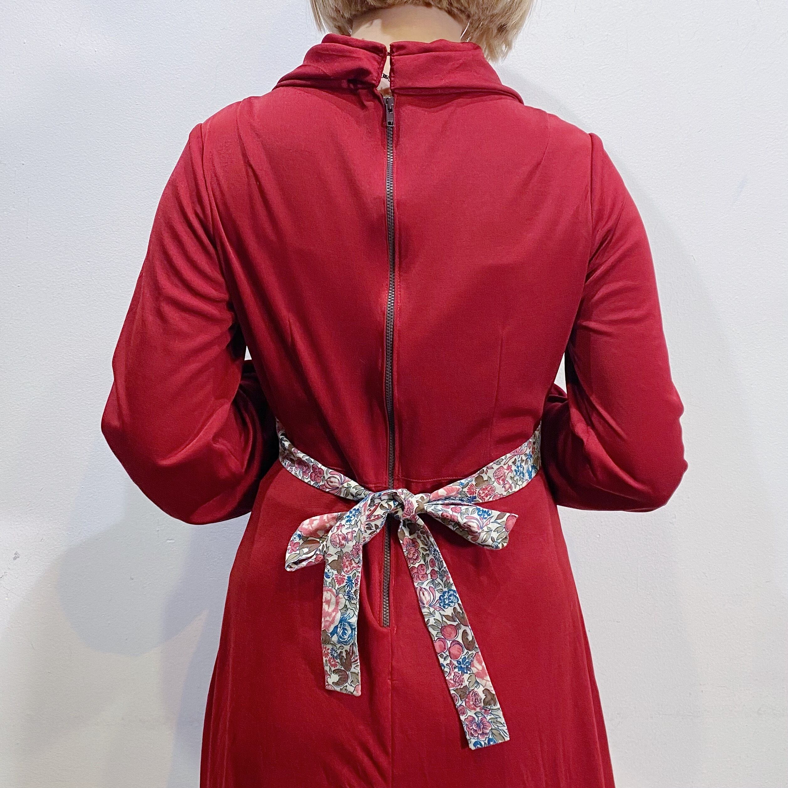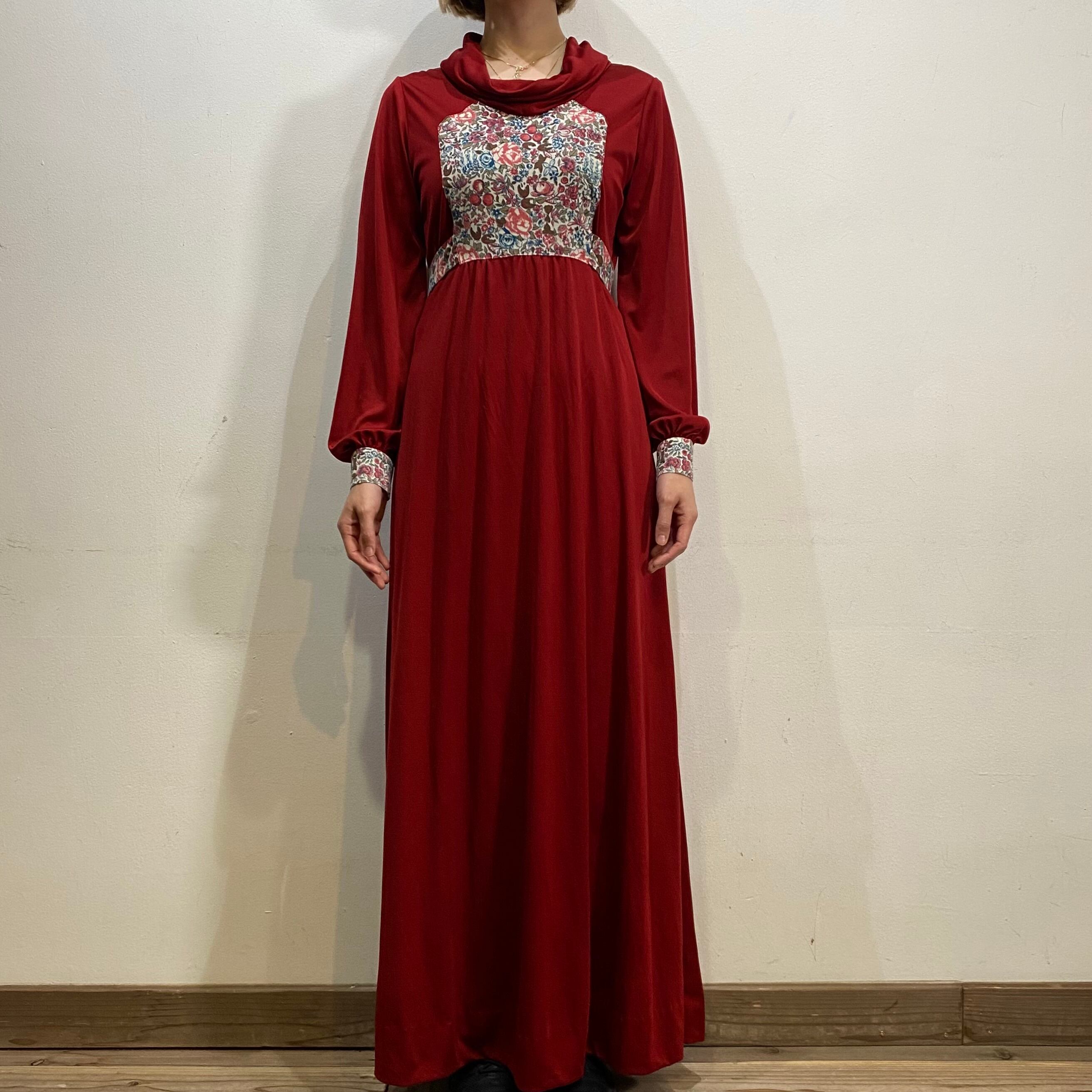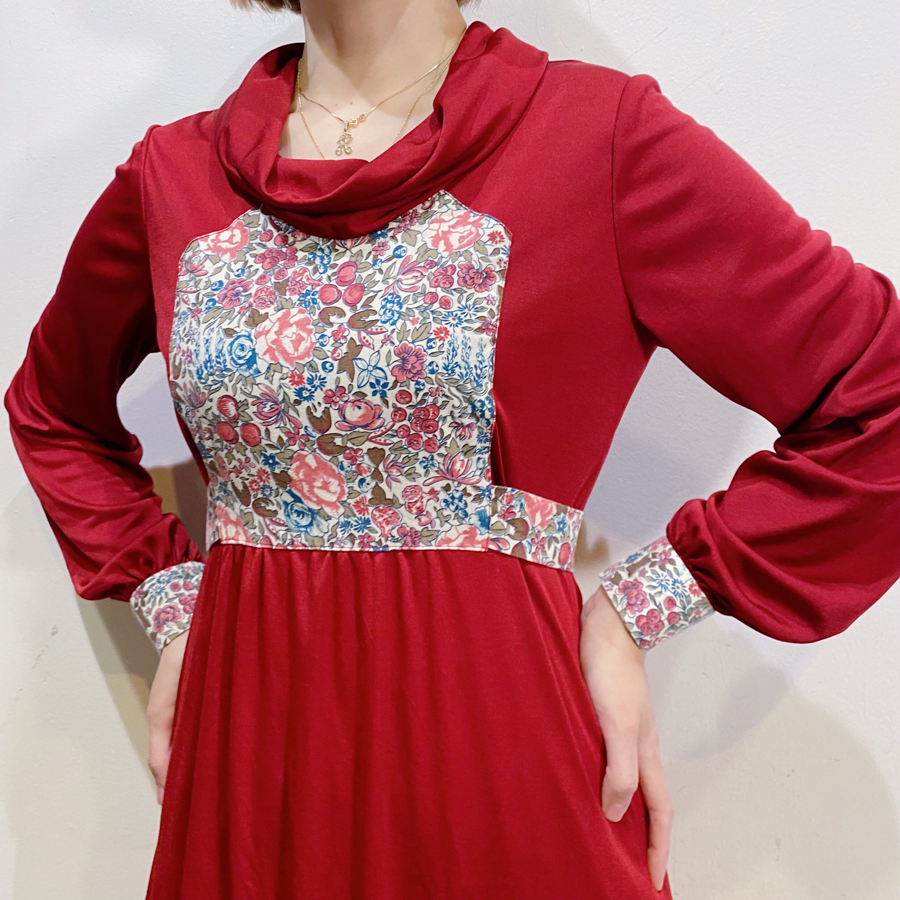 こっくりとしたボルドーカラーに花柄の切り替えが可愛い、70年代のワンピースです。