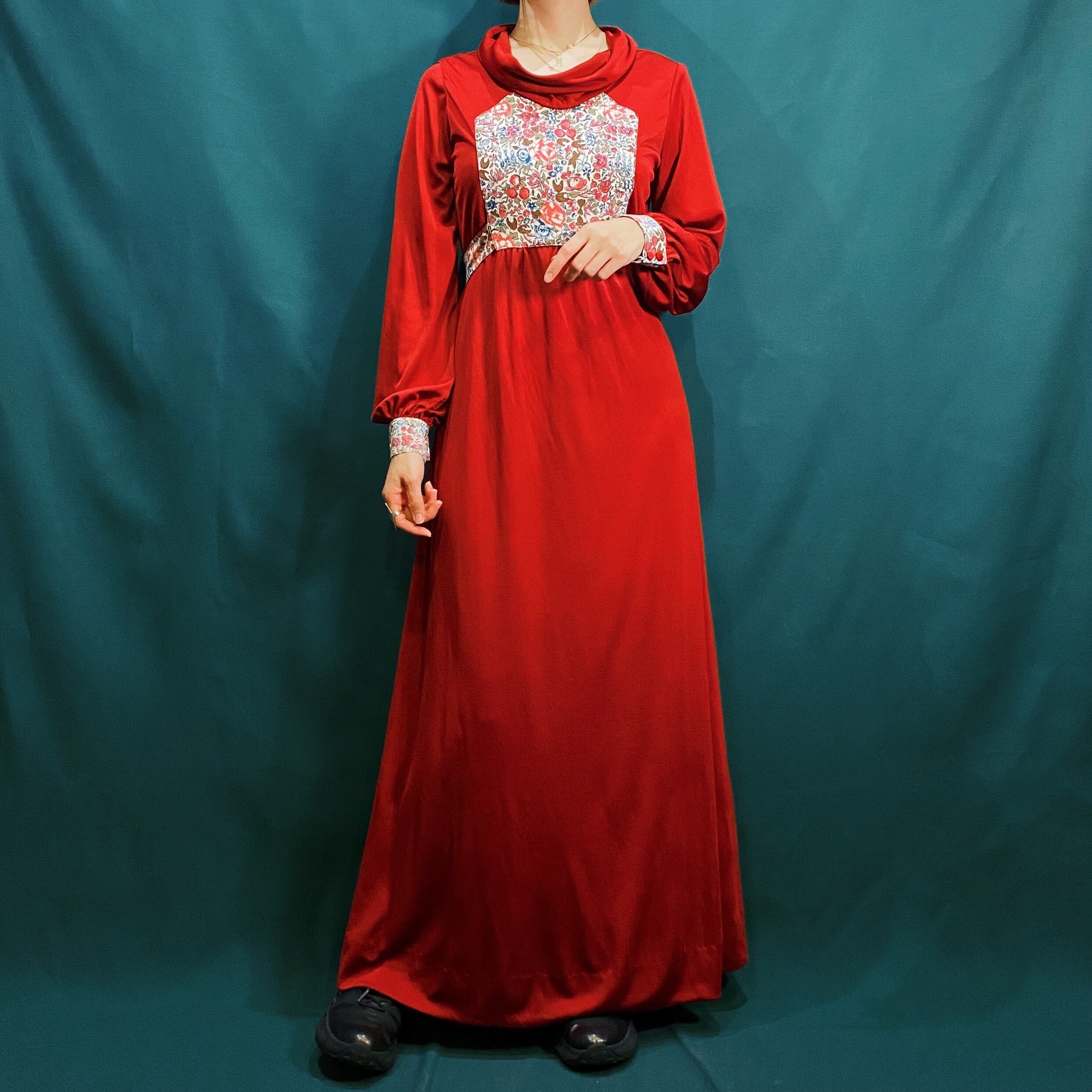 70s red flower printed long dress
