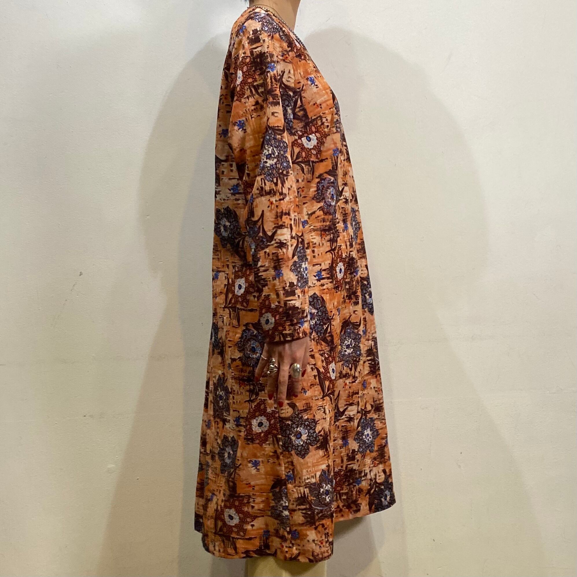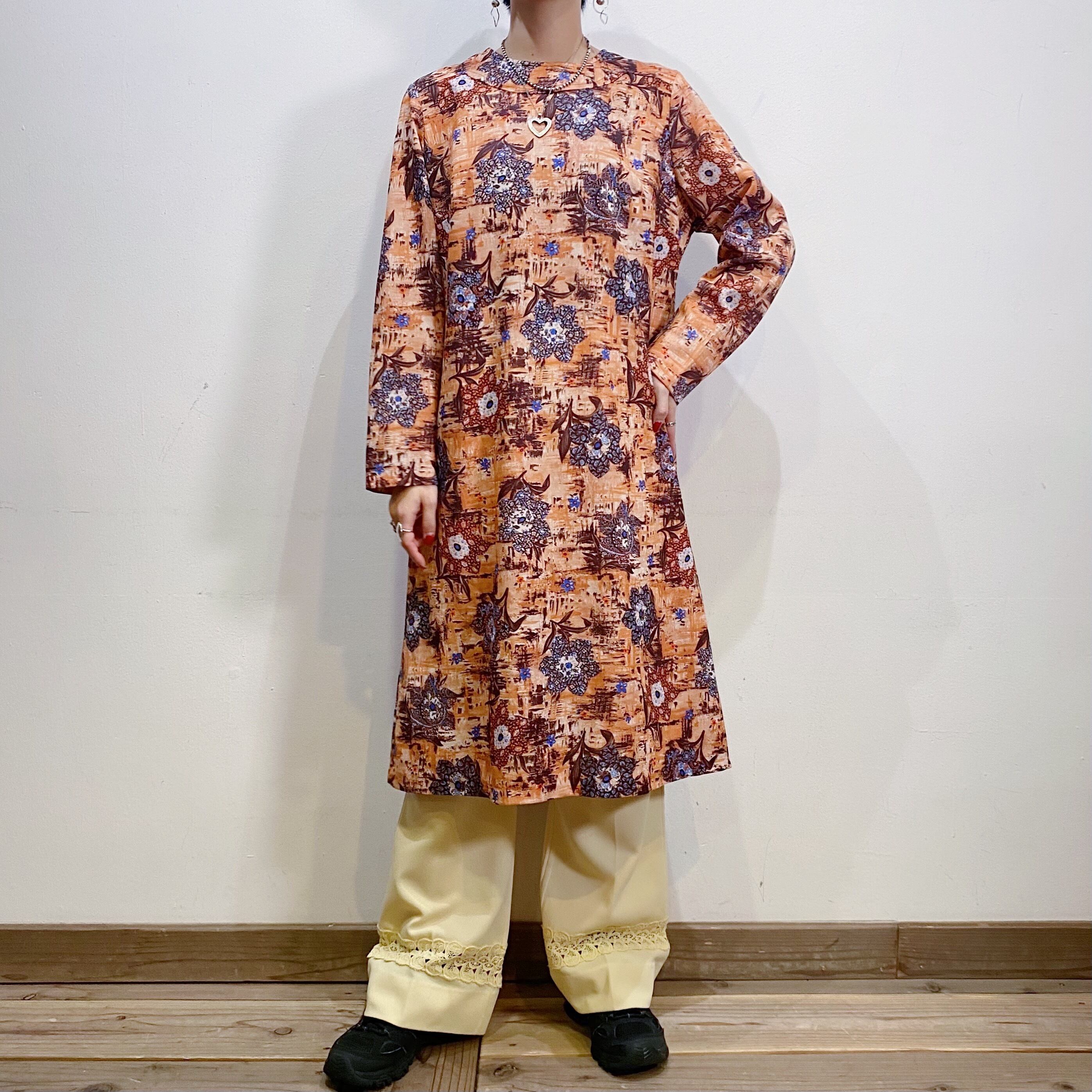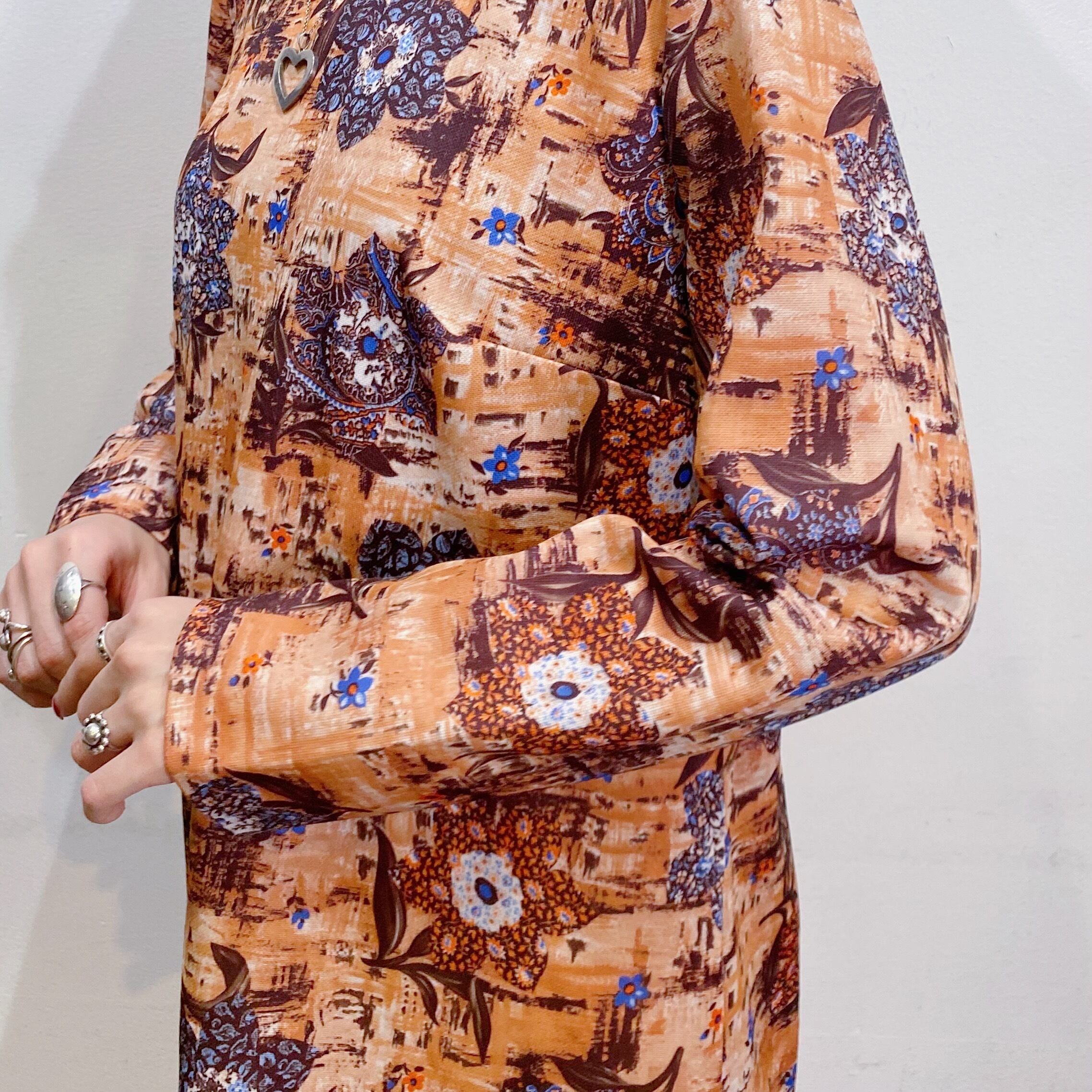 オレンジやブラウンの花柄が可愛い、70年代のワンピースです。