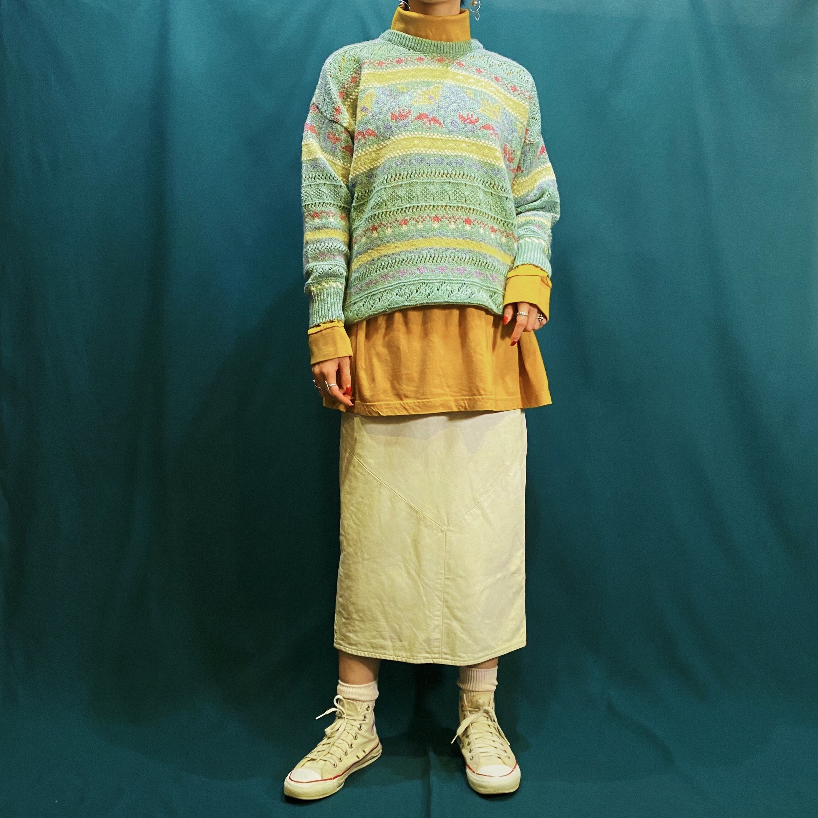 マスタードカラーが可愛い、ハイネックトップスです。