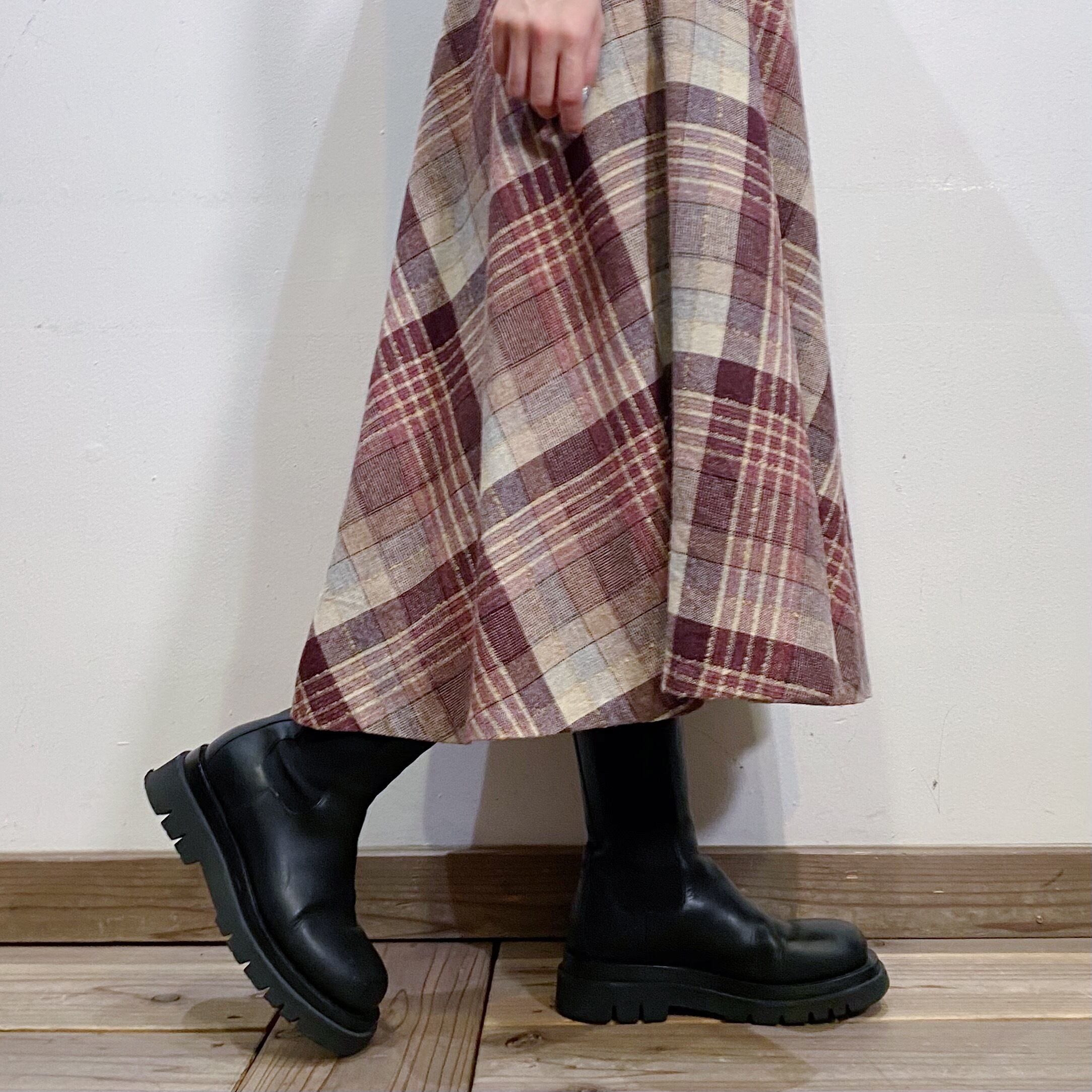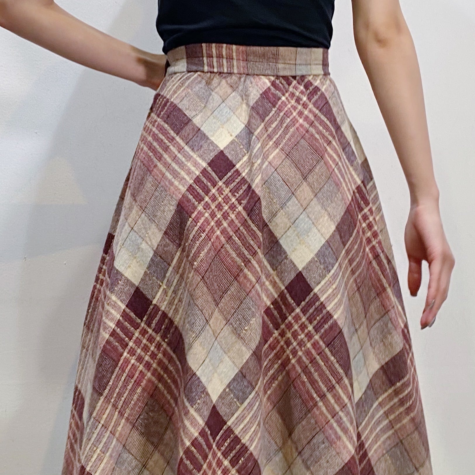 ボルドーのようなこっくりとした色合いで着こなしやすそうな、チェックのウールスカートです。