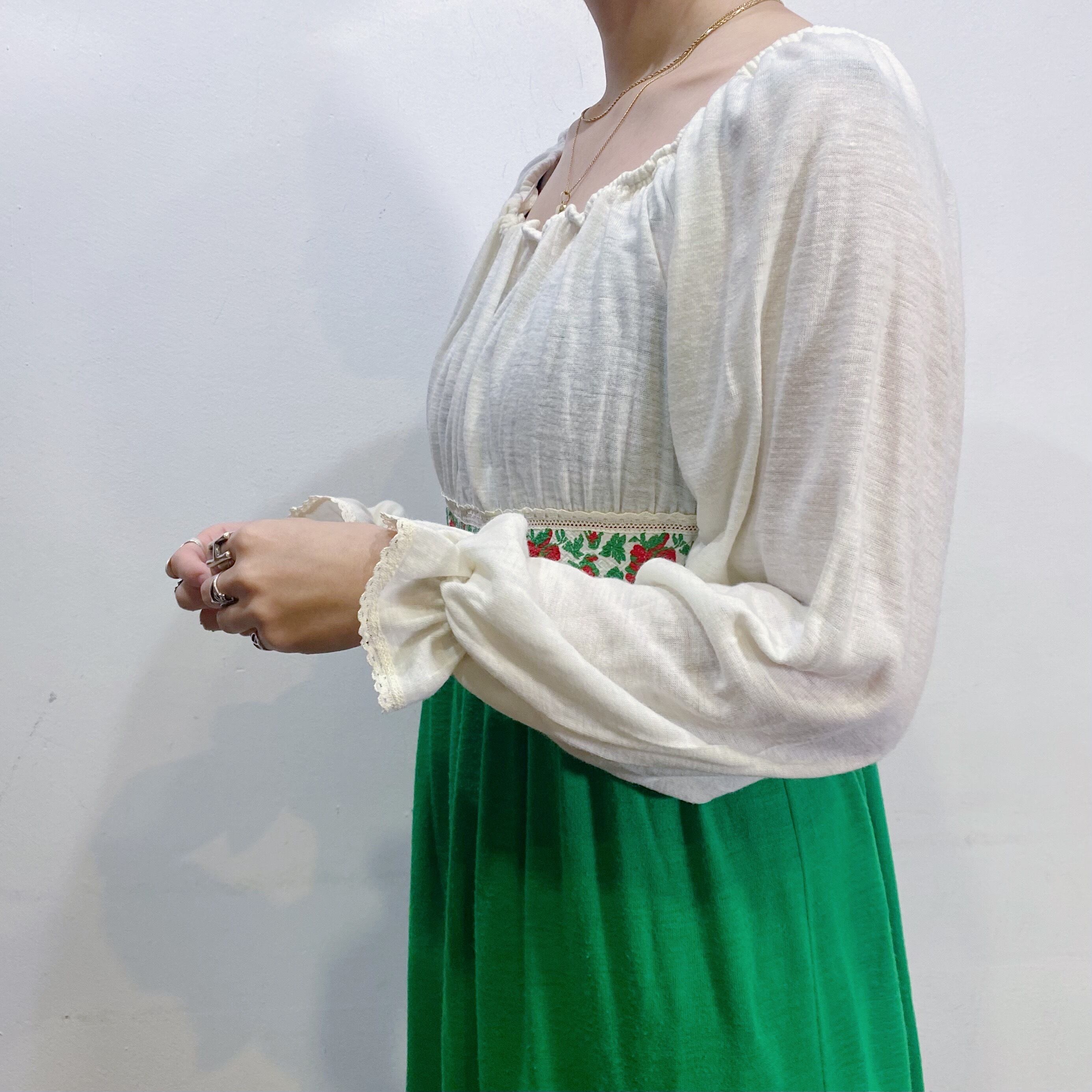 お花のチロルテープデザインが可愛い70年代のロングワンピースです。