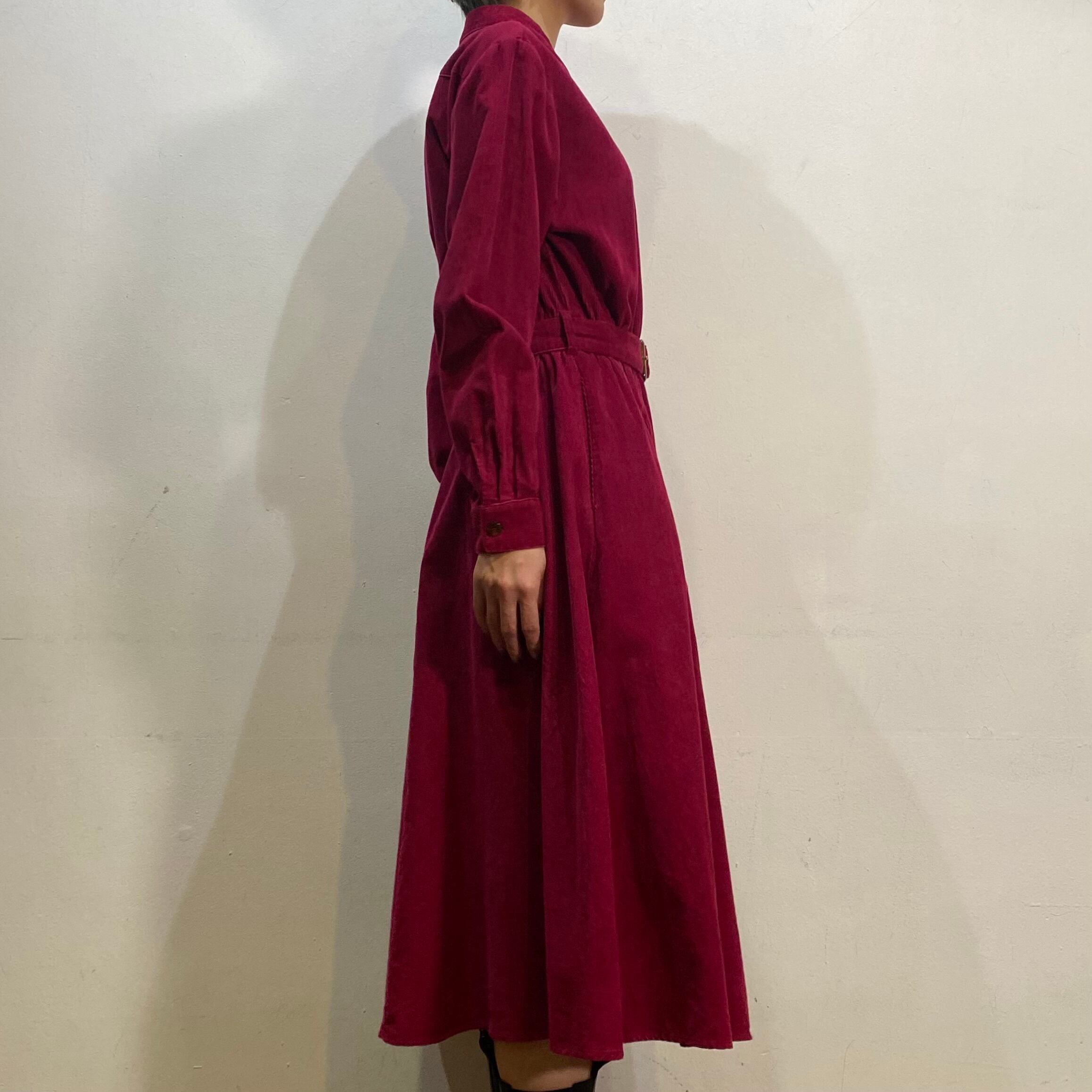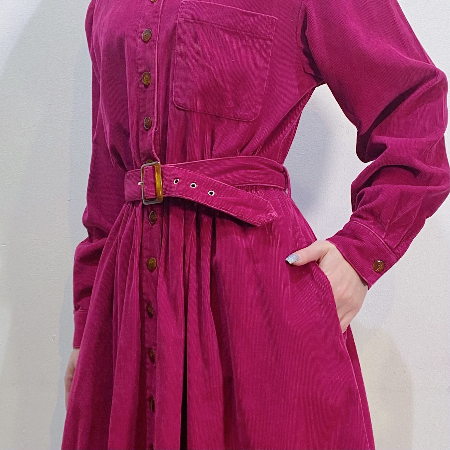 濃いめのピンクとパープルカラーの中間のような色味が可愛い、長袖シャツワンピースです。