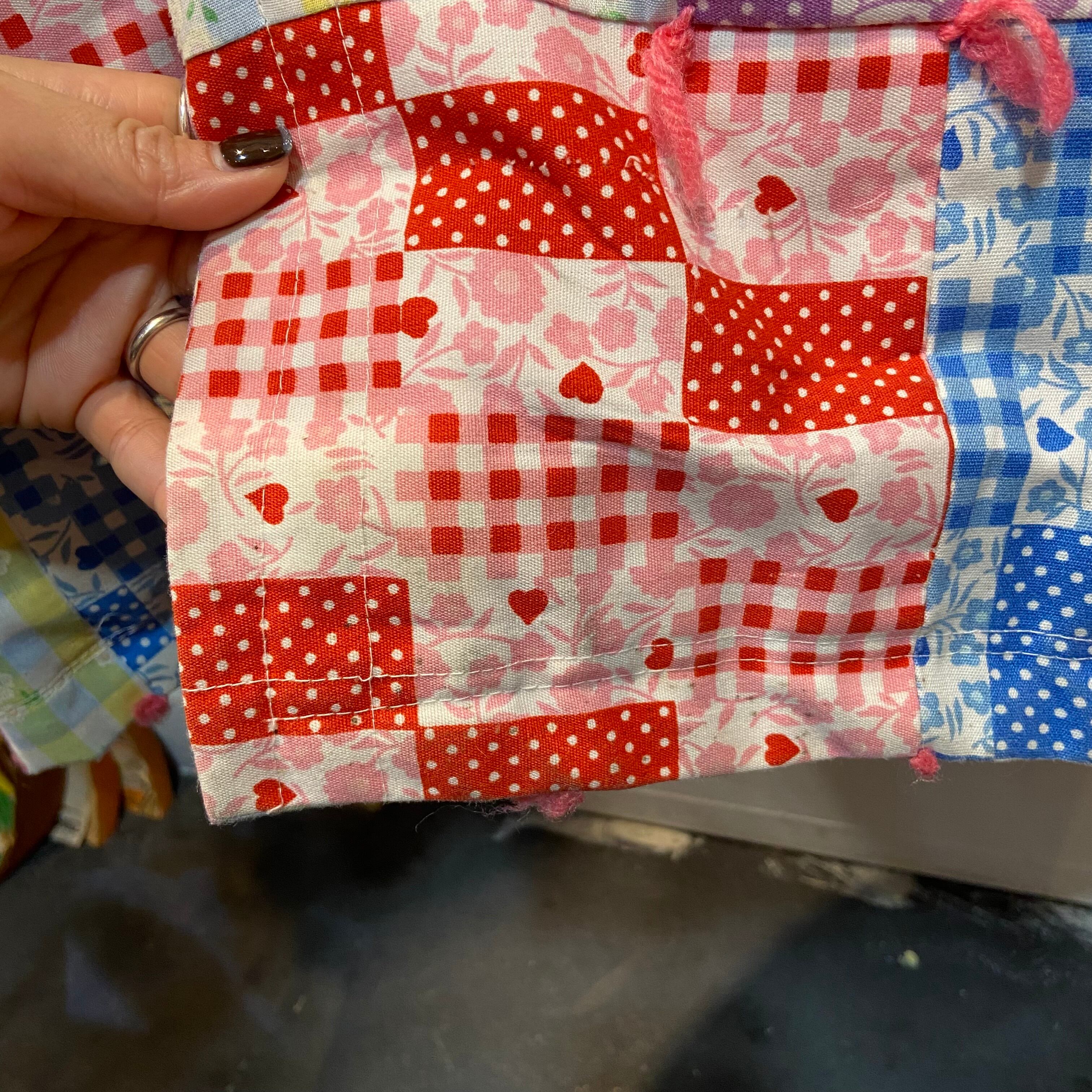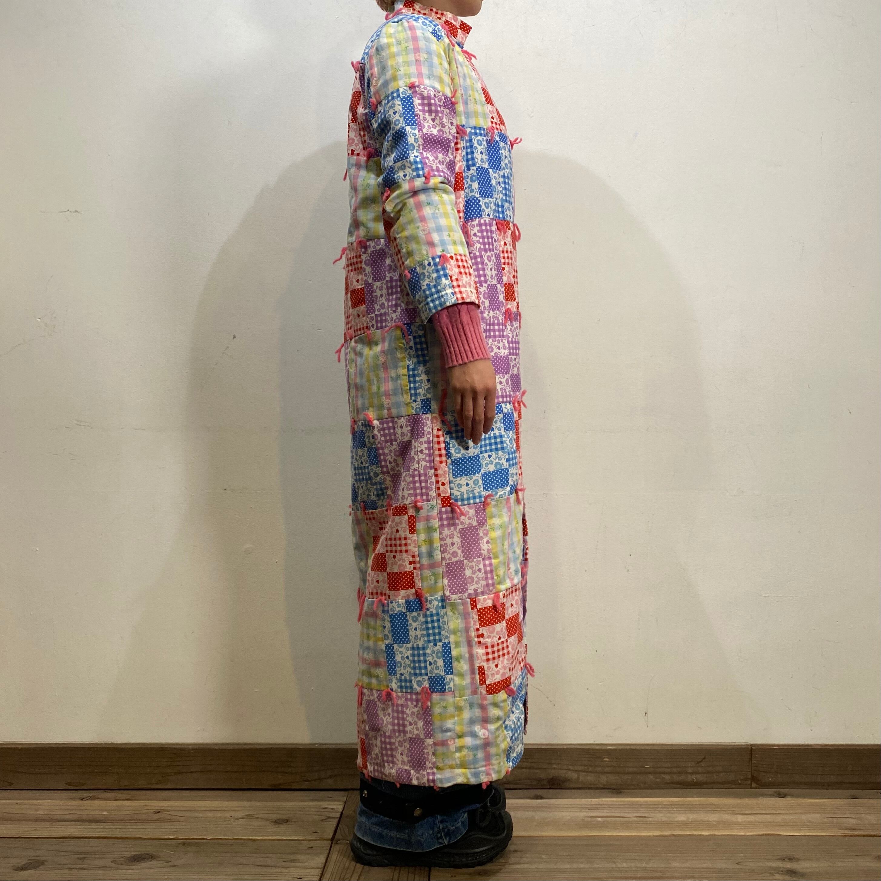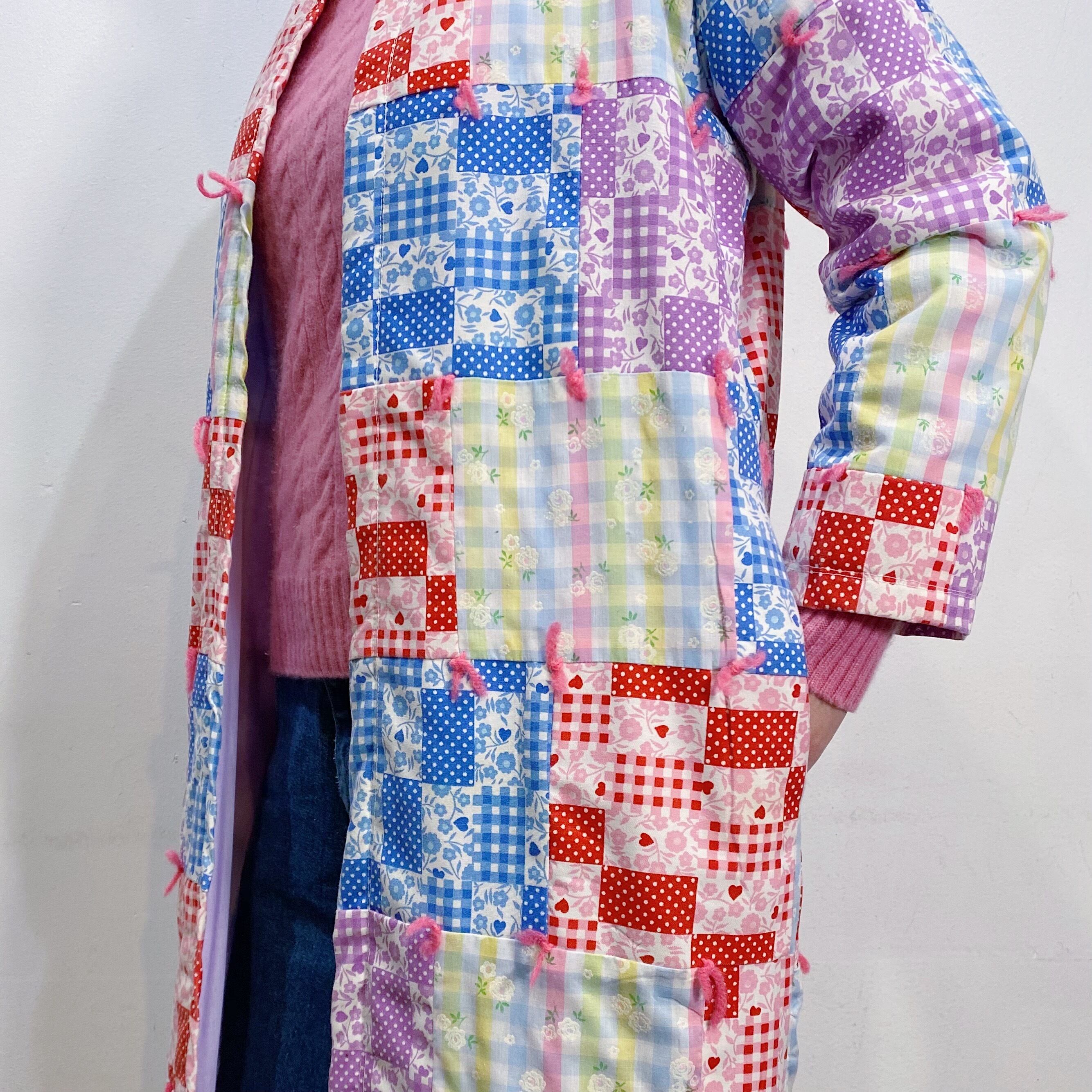 カラフルなチェック柄だけの生地を集めた、リアルパッチワークが最高に可愛い70年代のロングジャケットです。