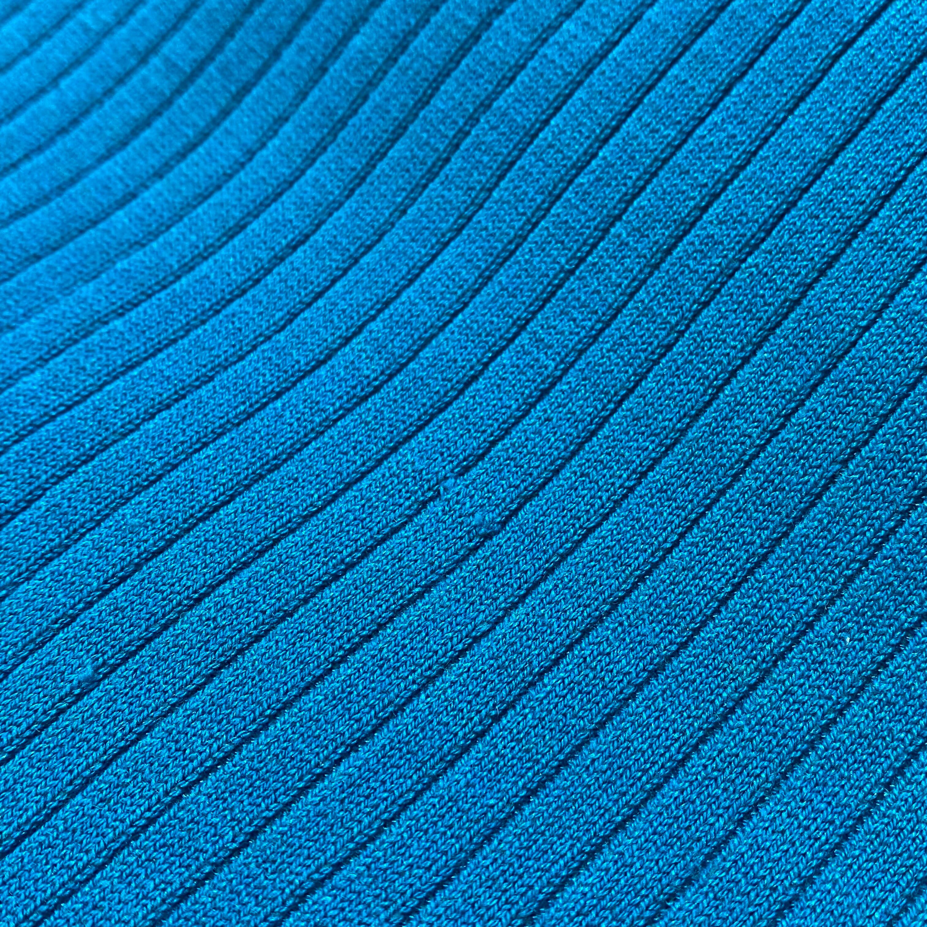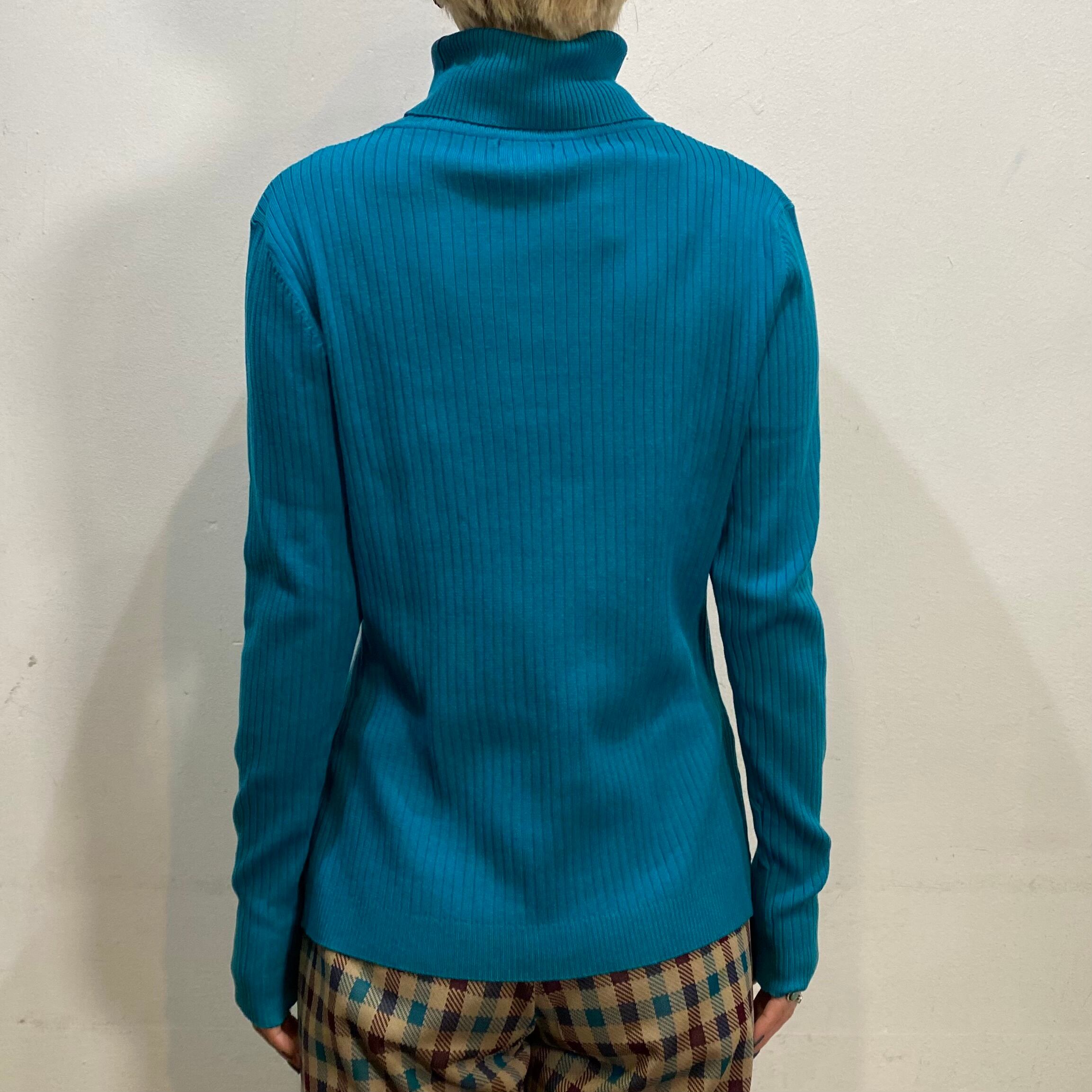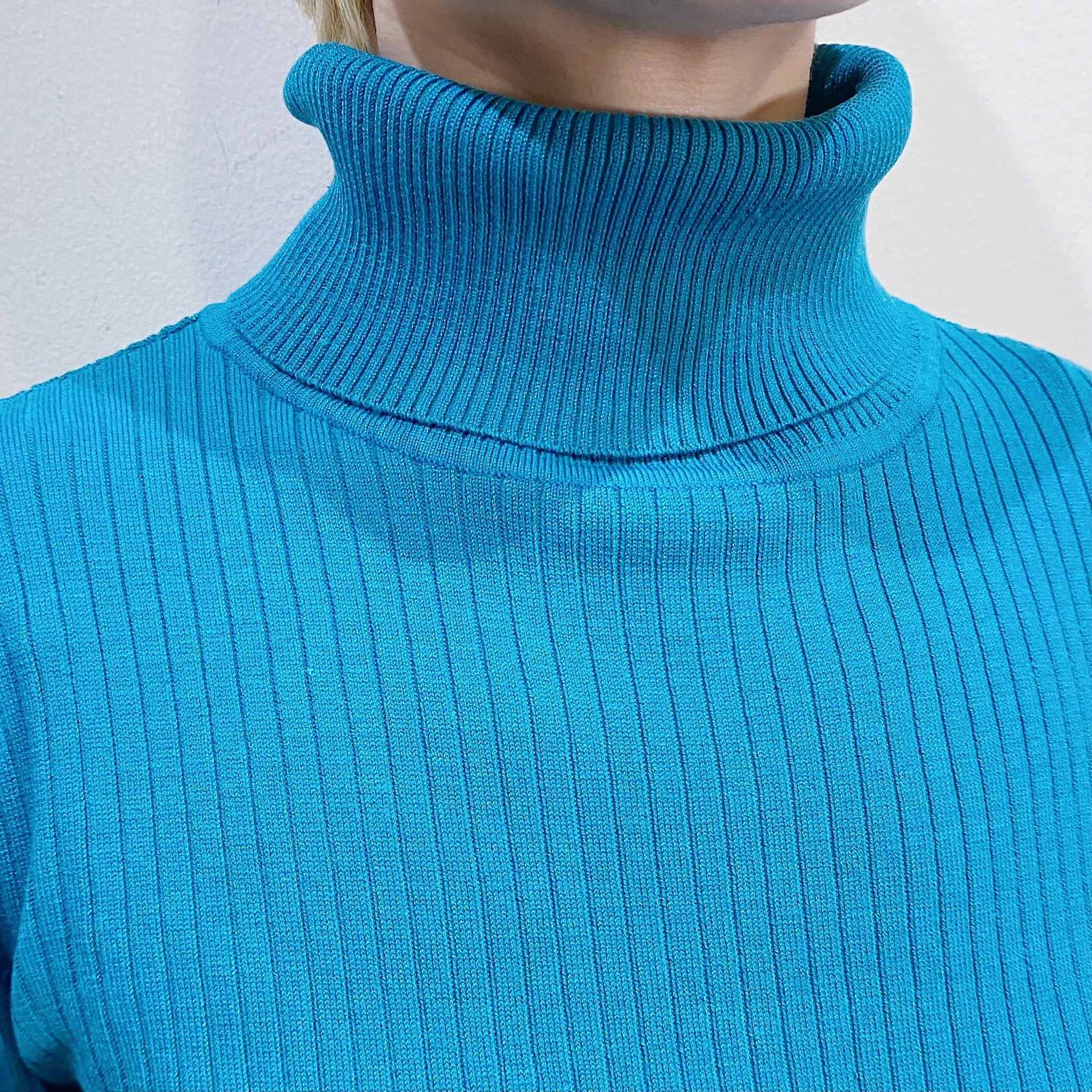 鮮やかなブルーの色合いがパッと目を惹く、ハイネックニットセーターです。