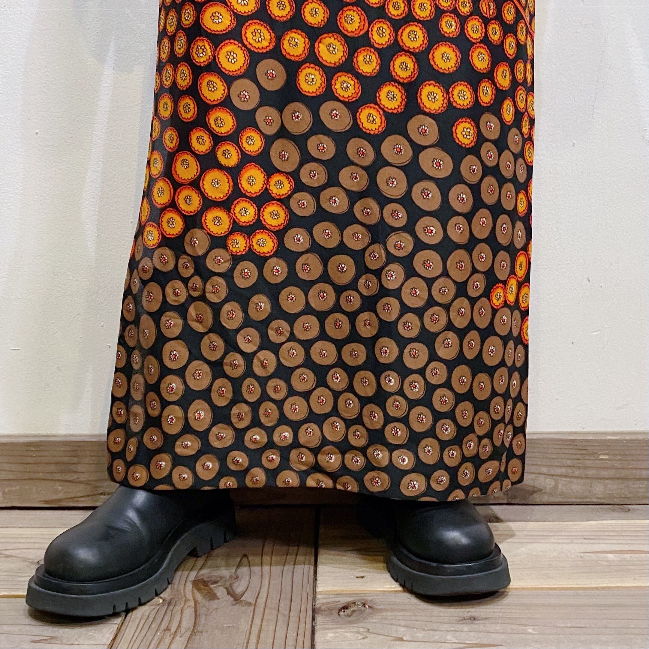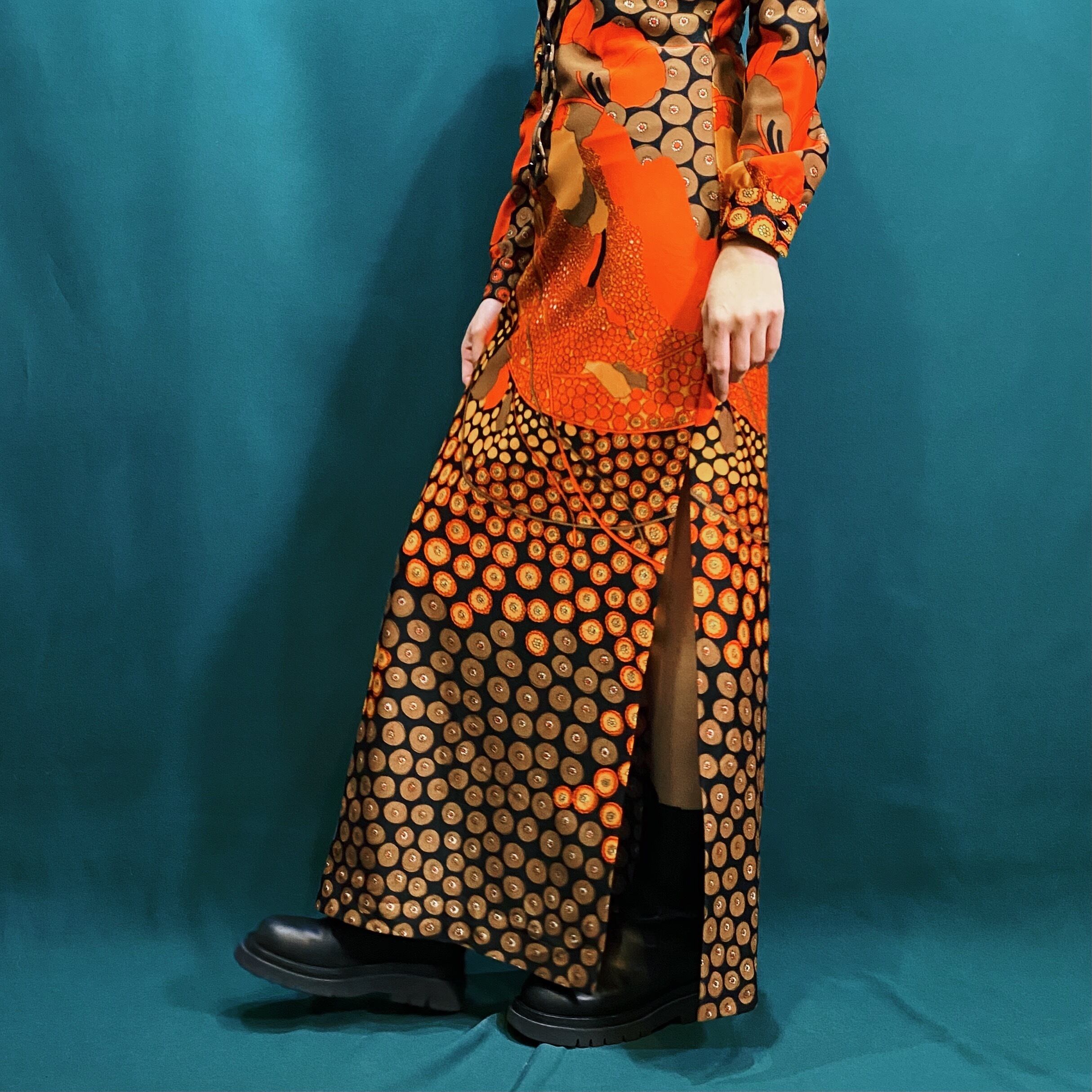 ブラックベースにオレンジやブラウンの色合いが可愛い、70年代のワンピースです。