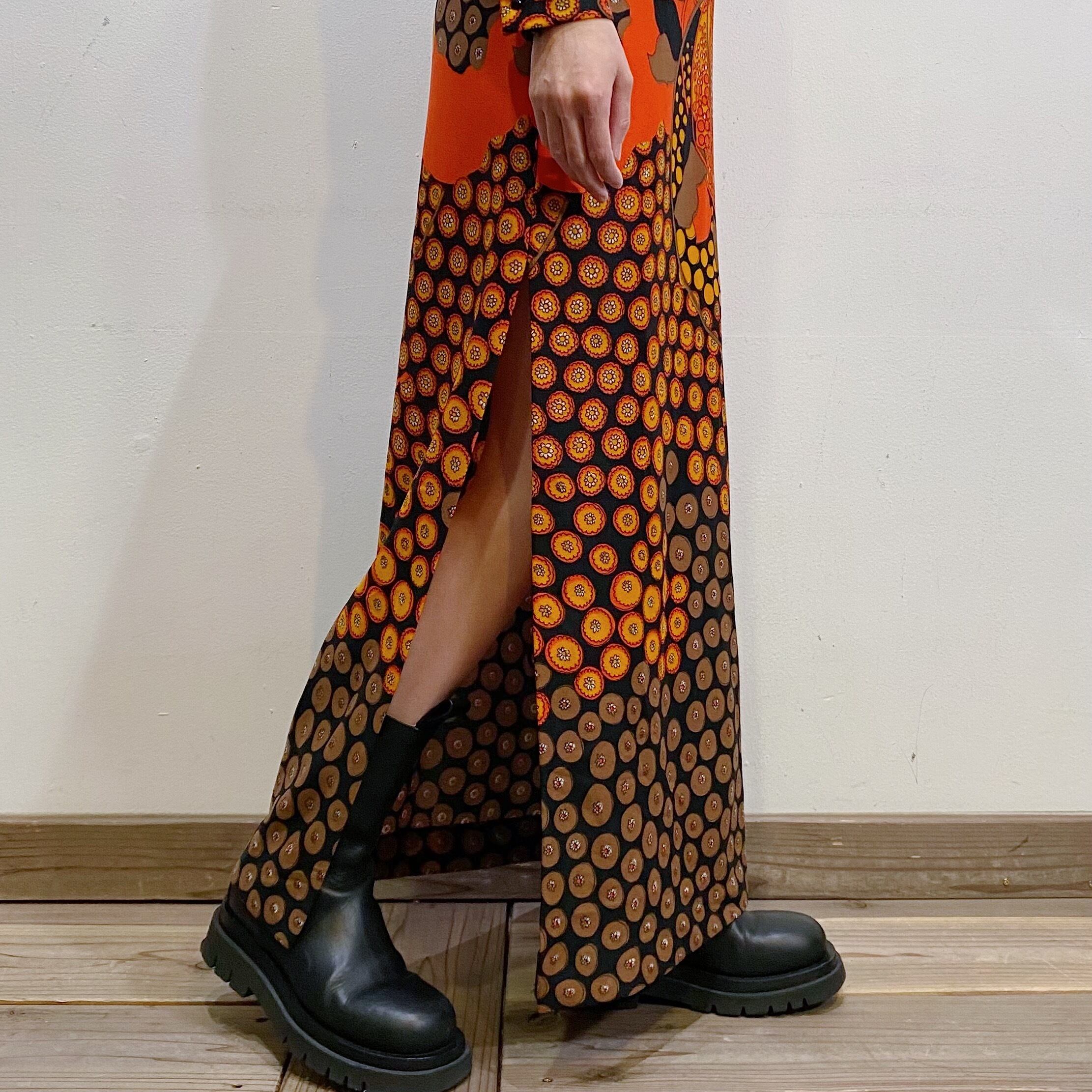 サイケなテキスタイルですが、襟付きなところやロング丈なことも相まって大人っぽく着ていただけますよ。