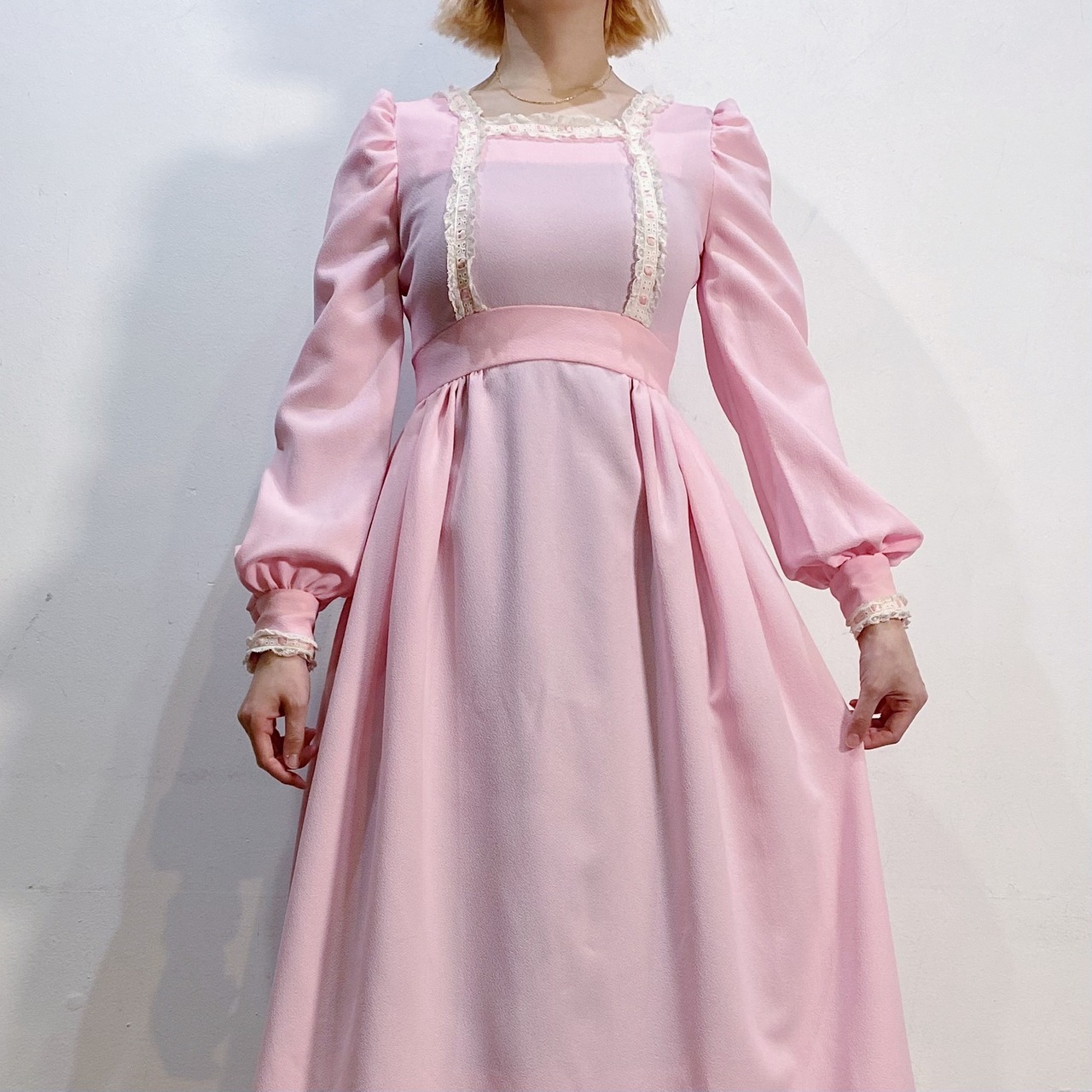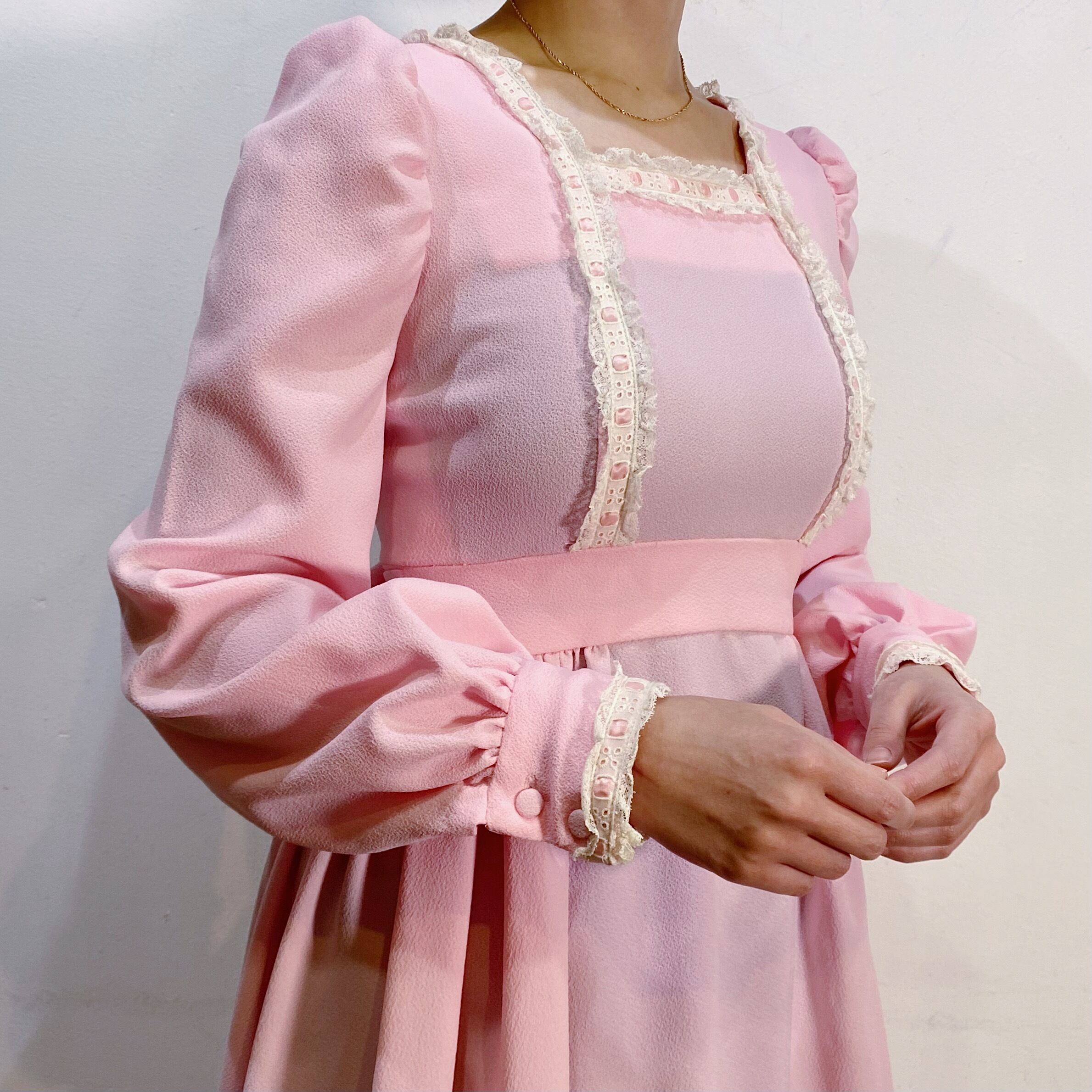 淡いピンクとレースの組み合わせが可愛い、70年代のワンピースです。