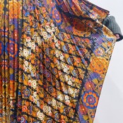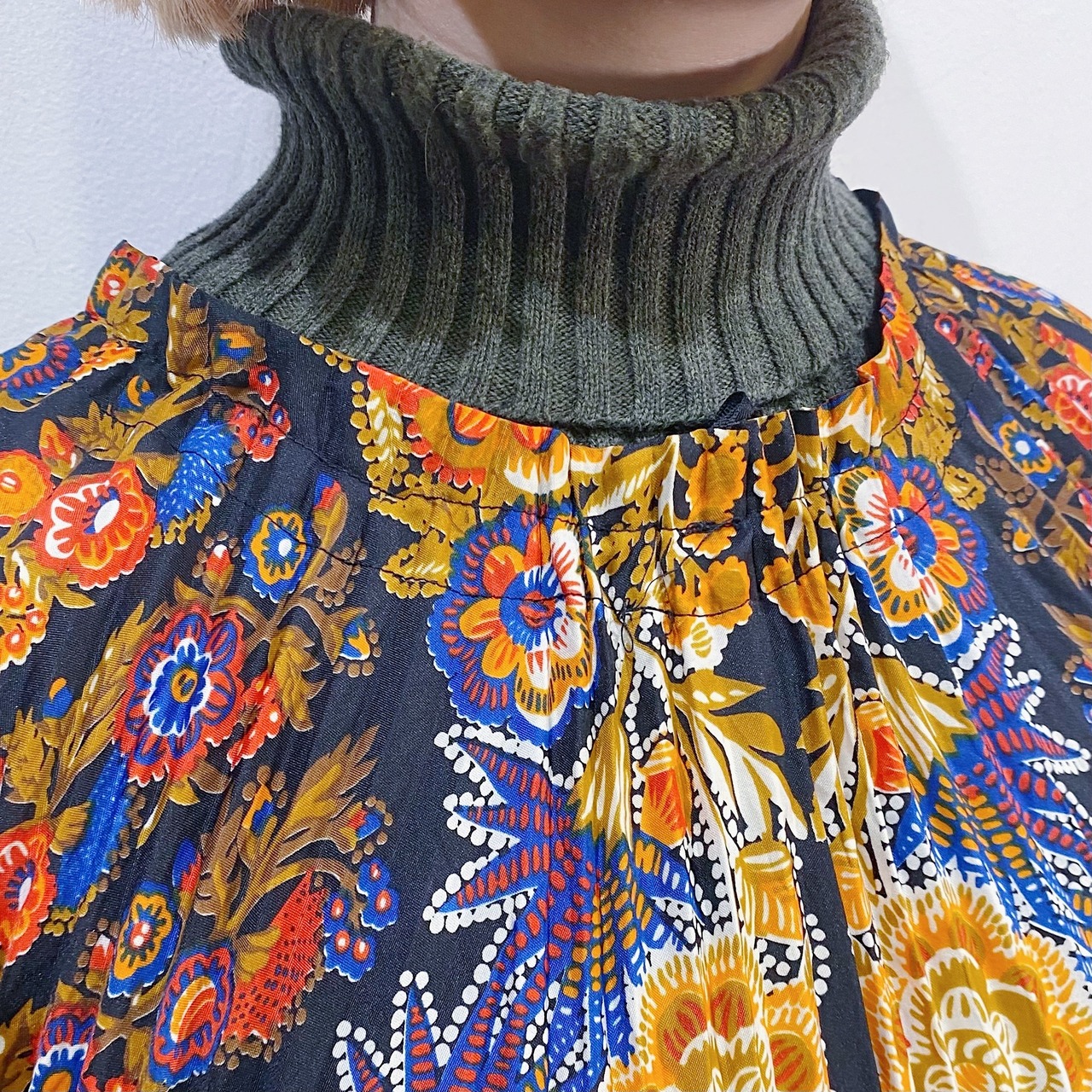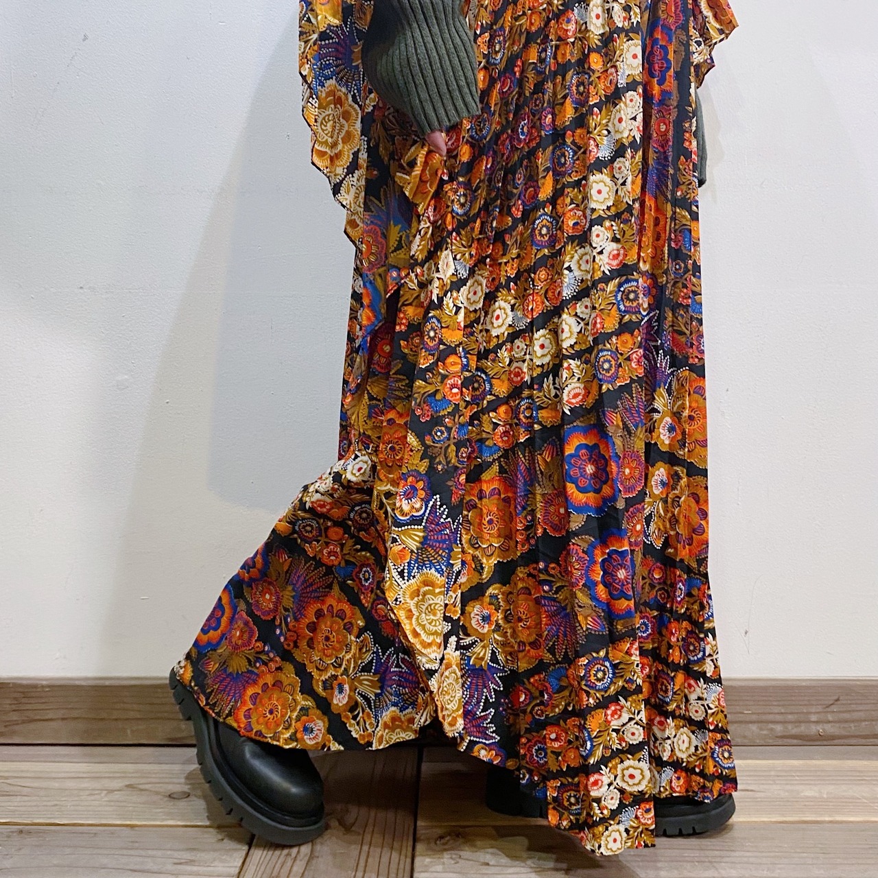 ブラックベースにオレンジ・ブルーの色鮮やかな花柄が素敵な、60~70年代のワンピースです。