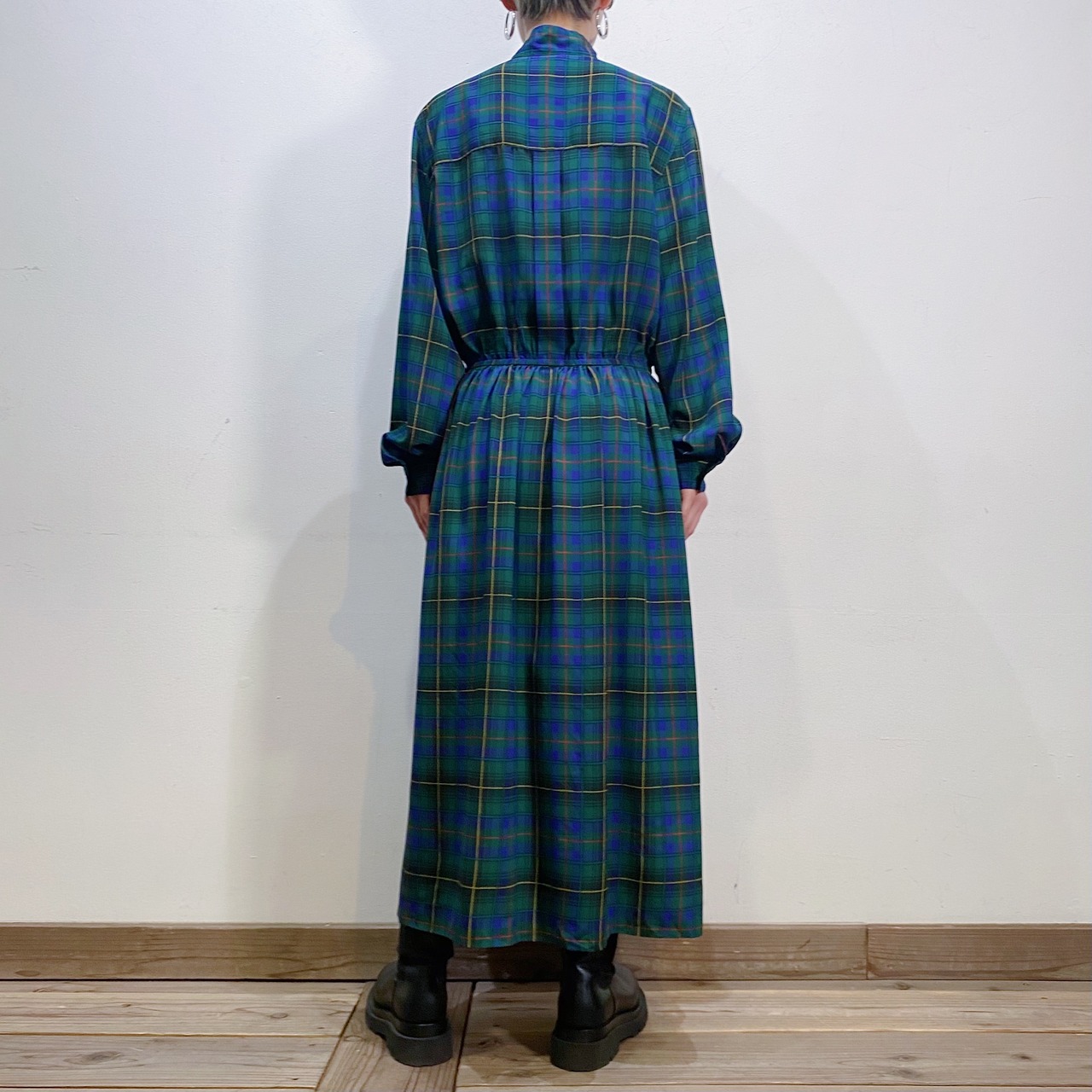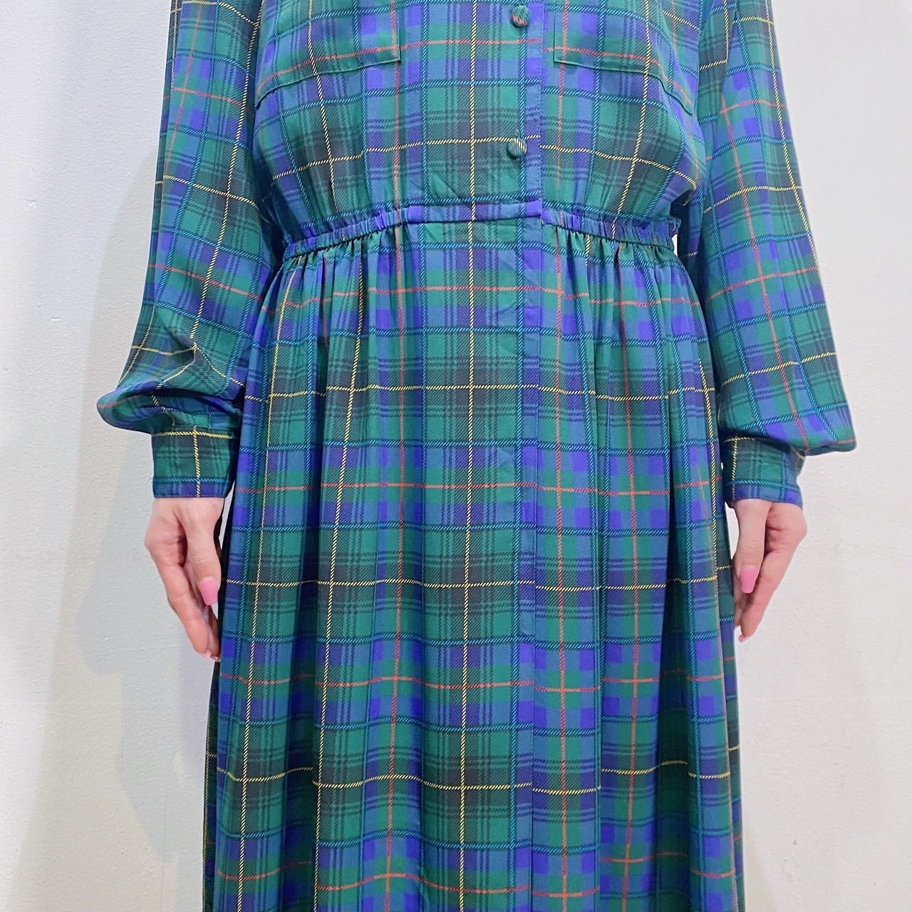 グリーンとネイビーのチェックの色合いが可愛い、80年代のシャツワンピースです。