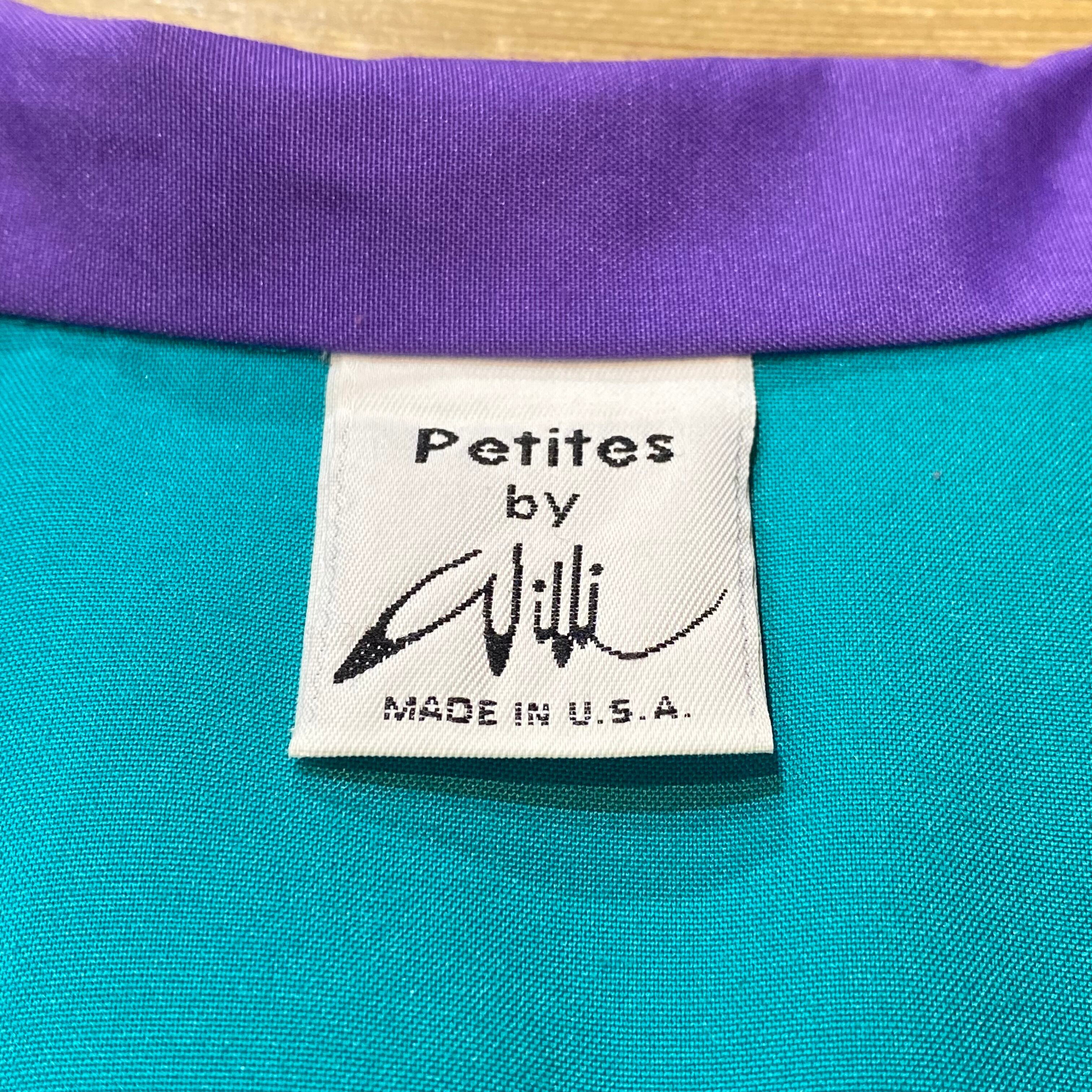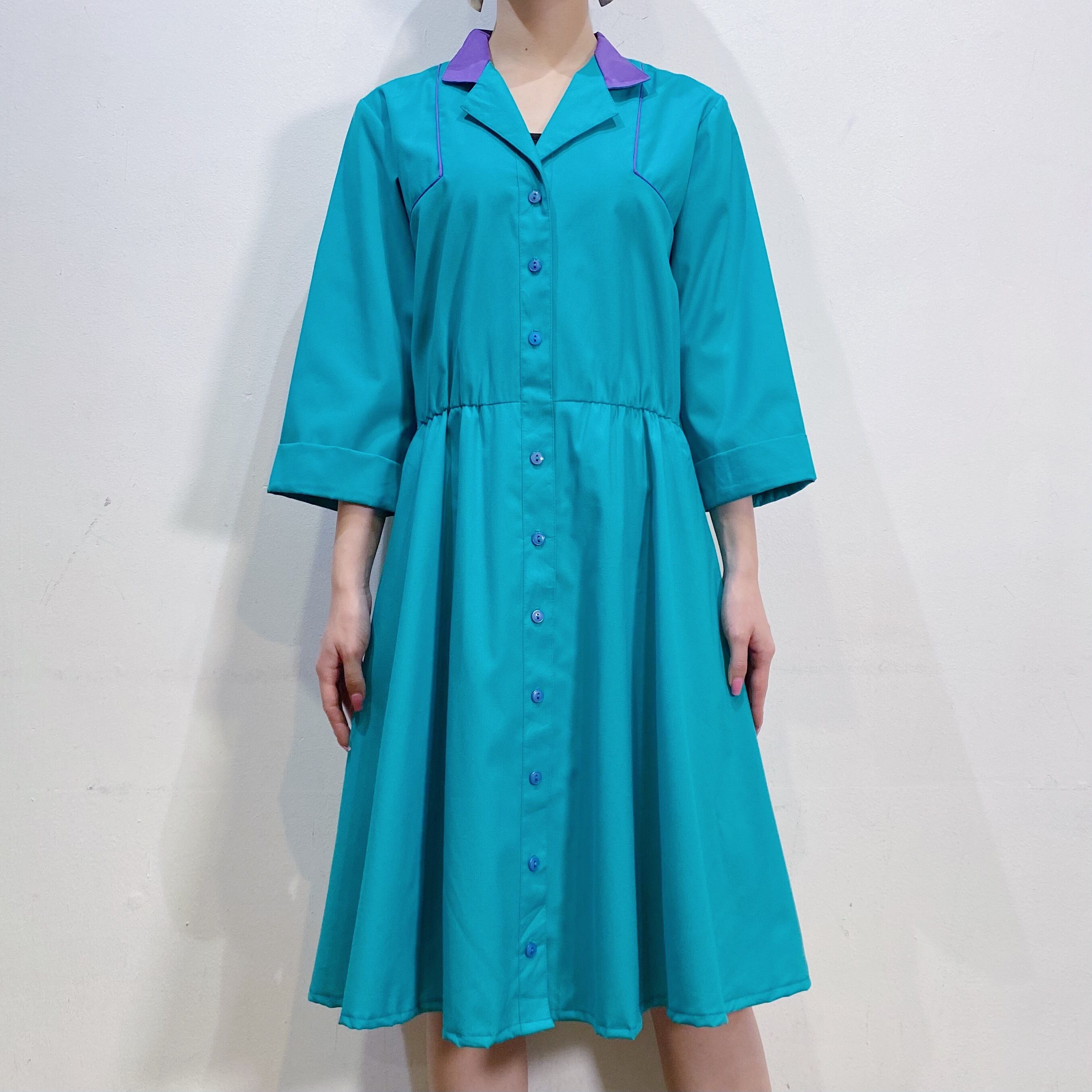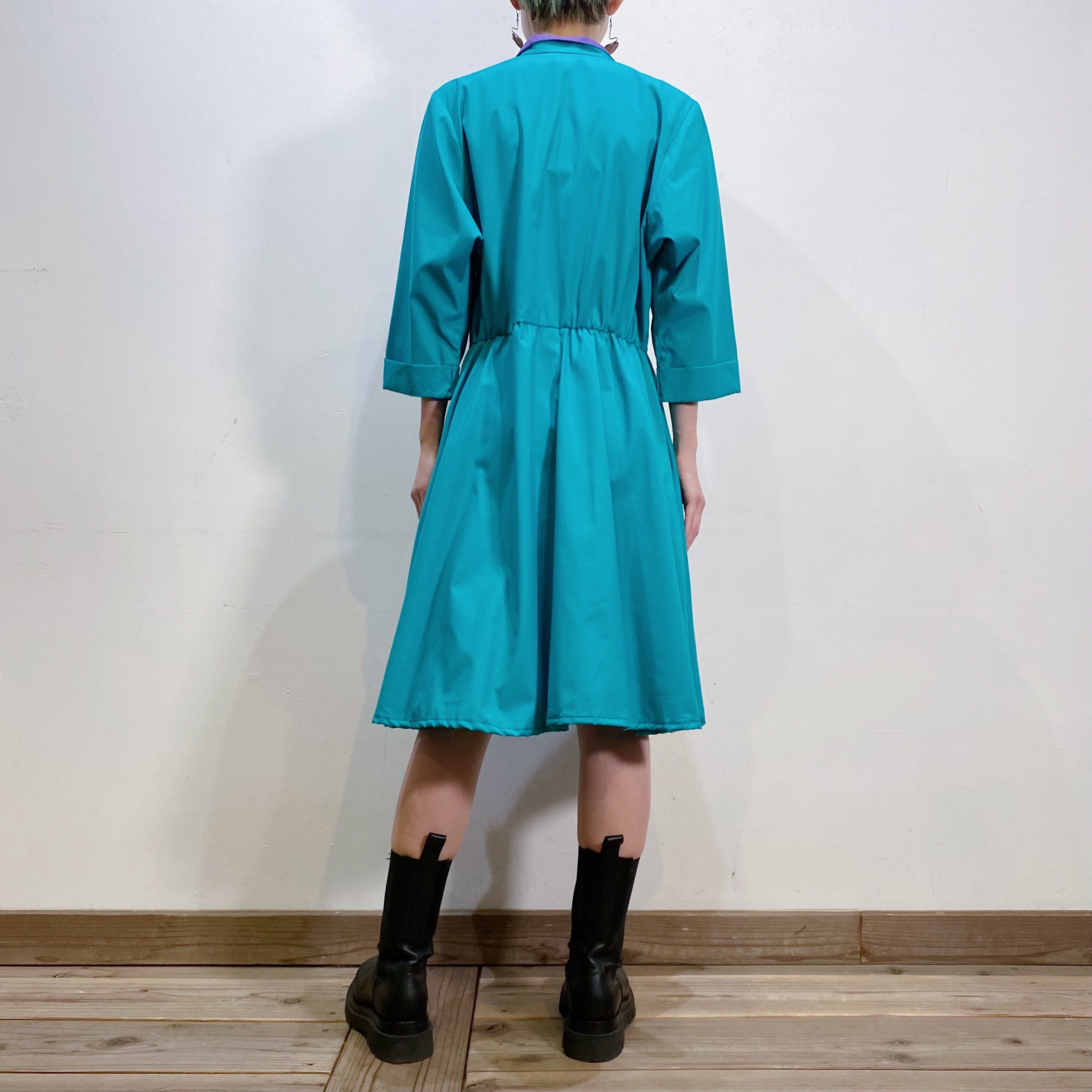 少し緑がかったターコイズブルーカラーが目を惹く、80年代のシャツワンピースです。