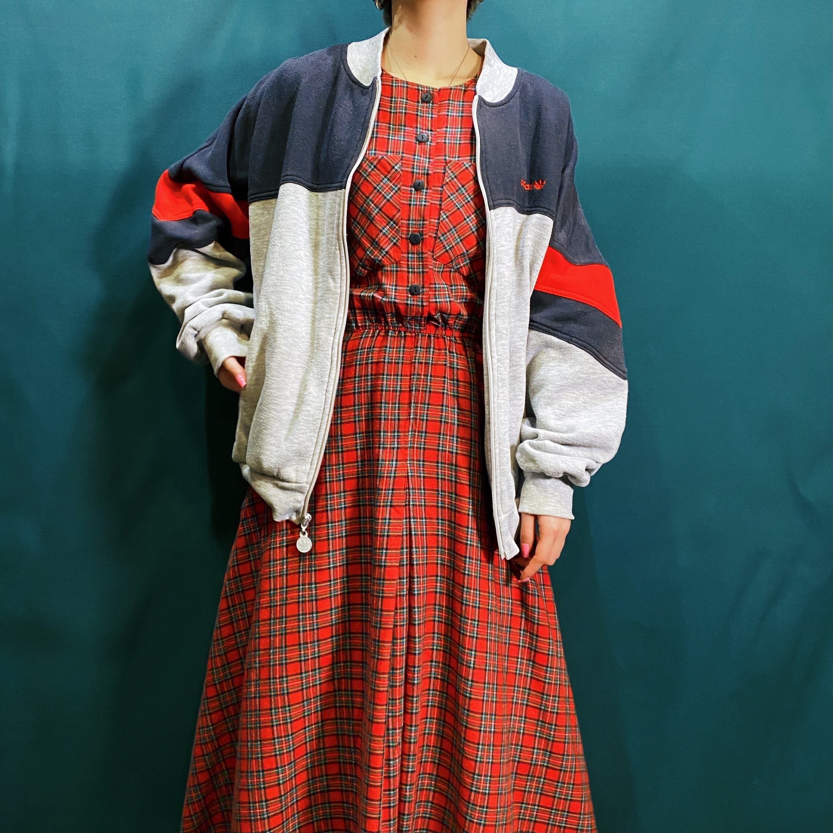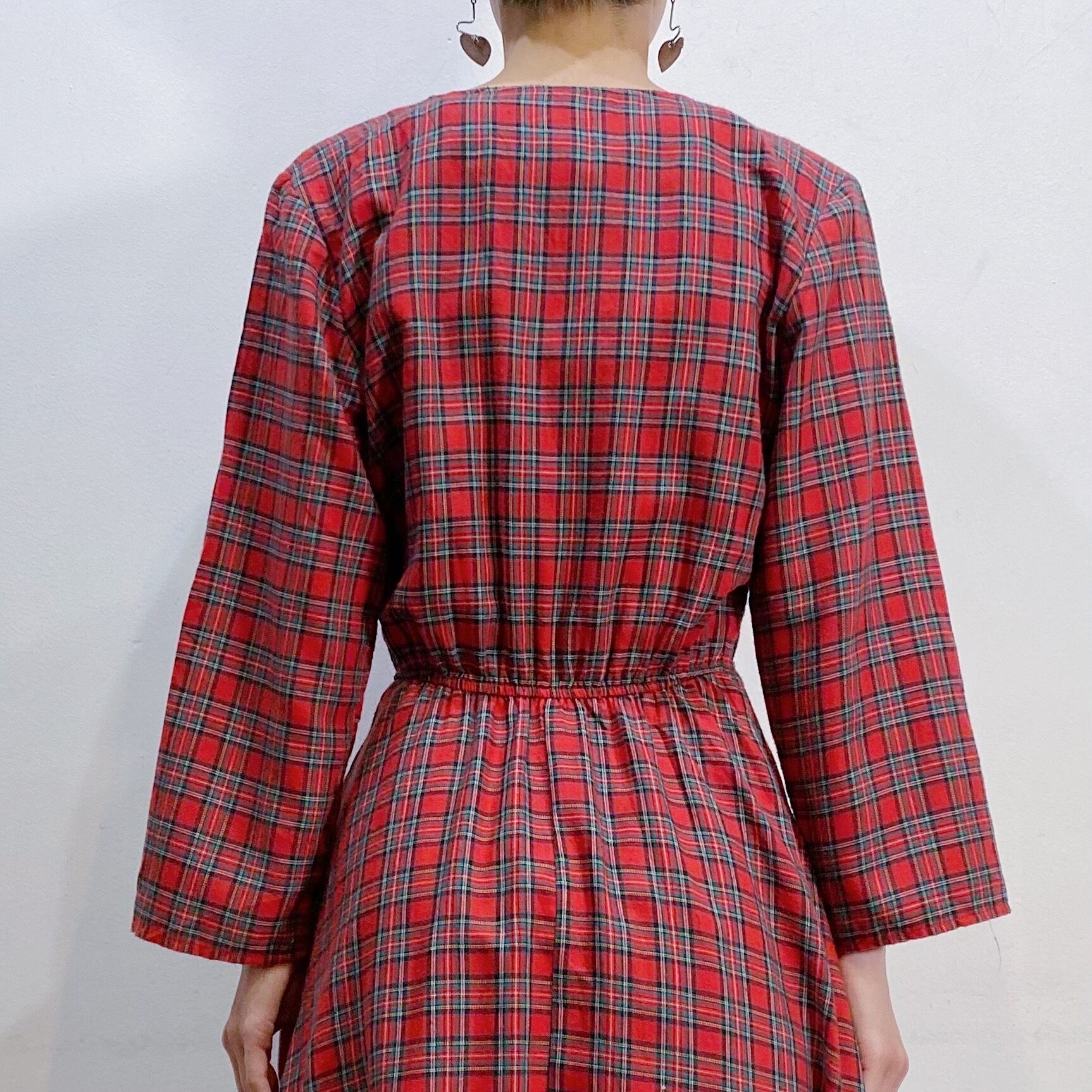レッド×グリーンのチェック柄が可愛い、80年代のロングワンピースです。