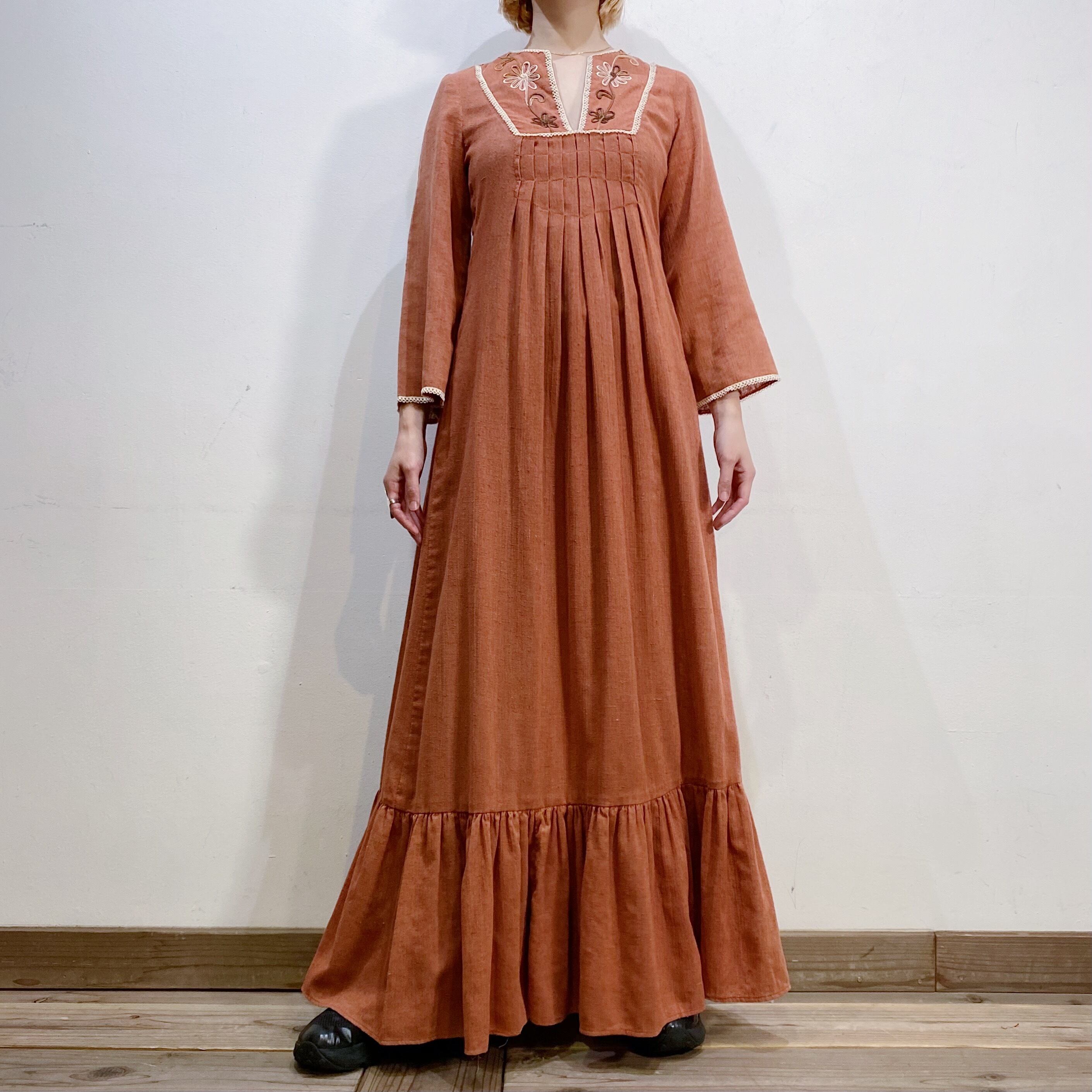 胸元のお花の刺繍が素敵な70年代のワンピースです。