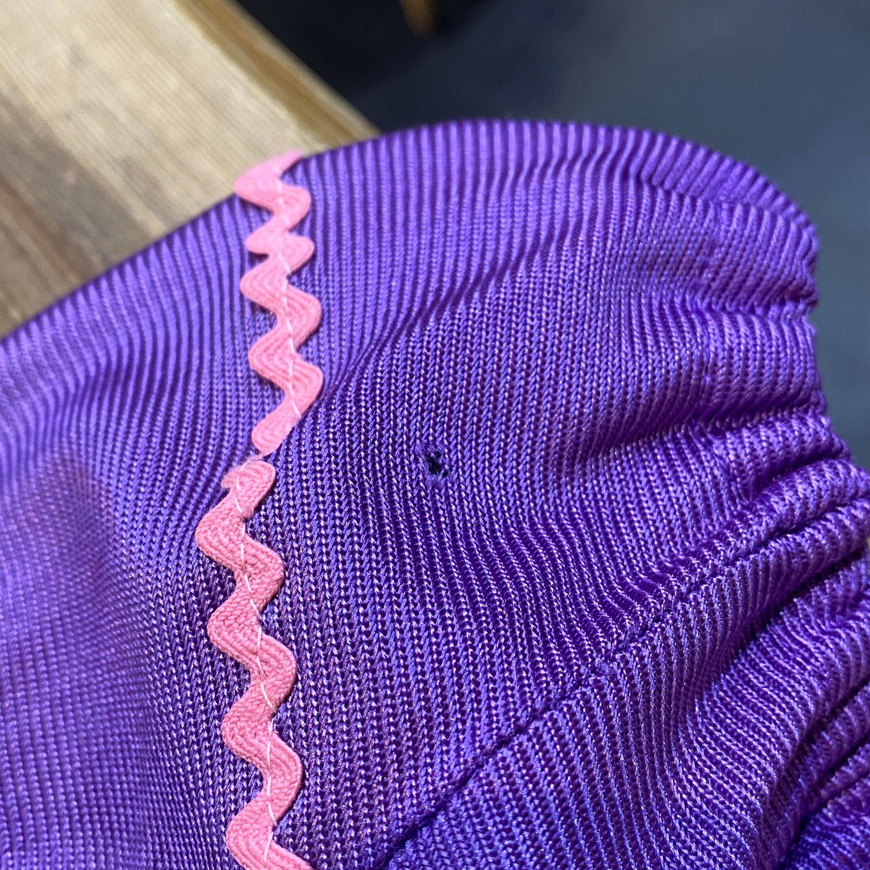 パープルとピンクの色合わせも可愛く、着るだけでハッピーになれる一枚。