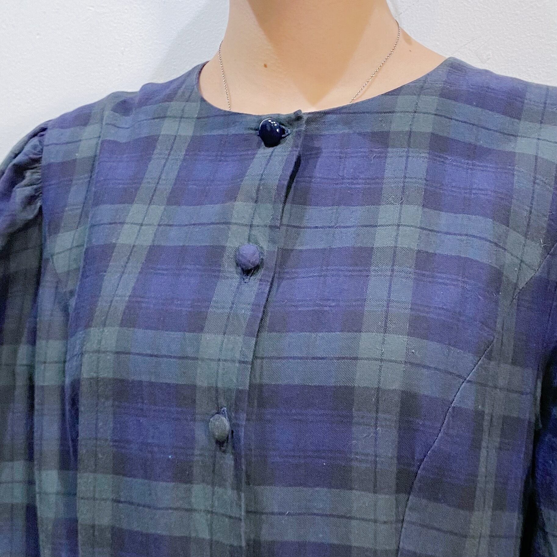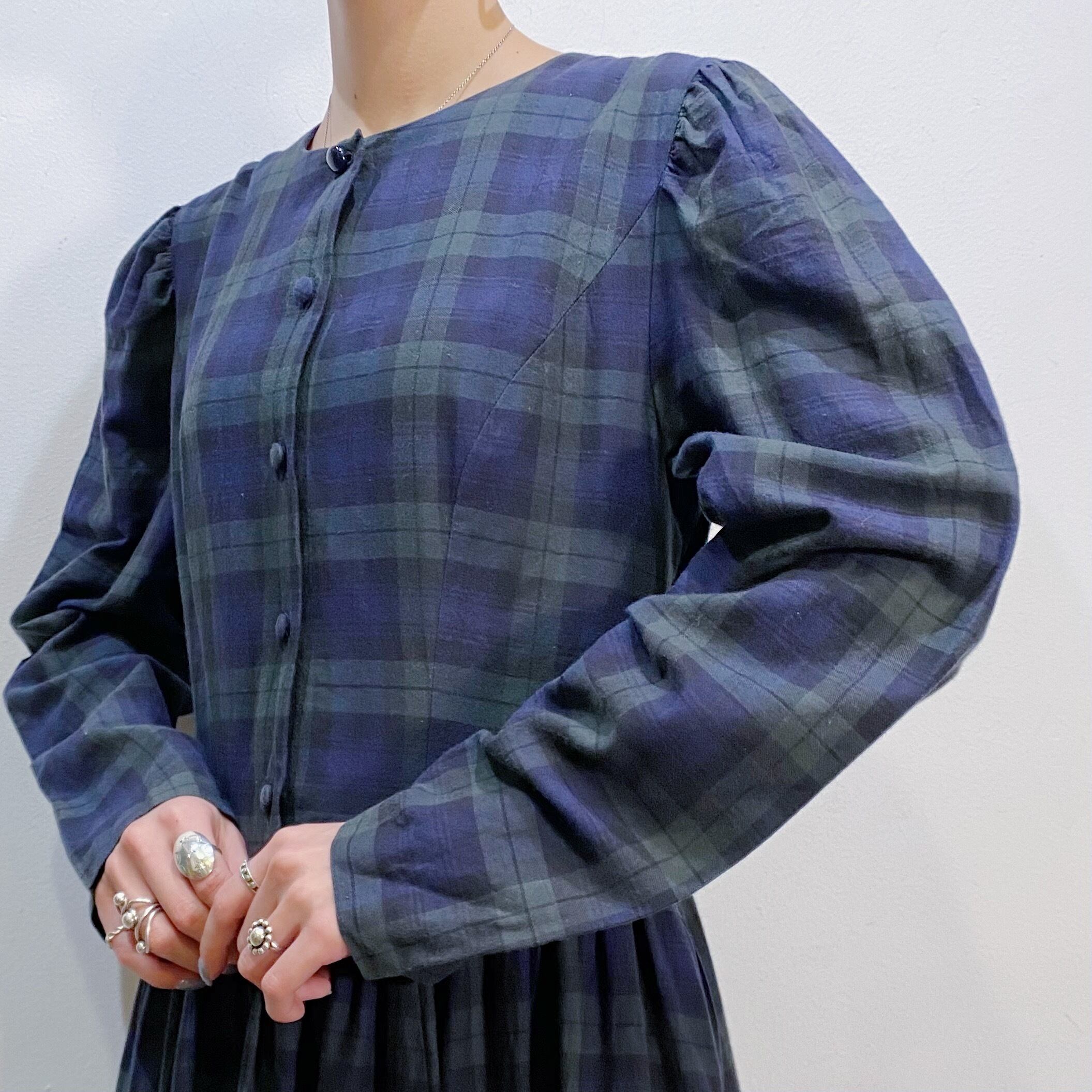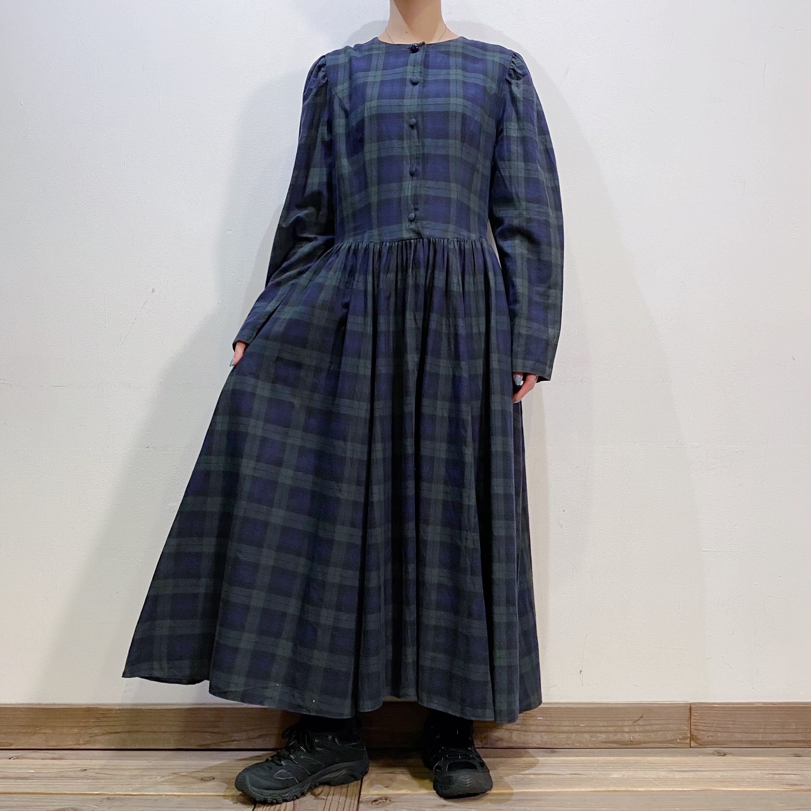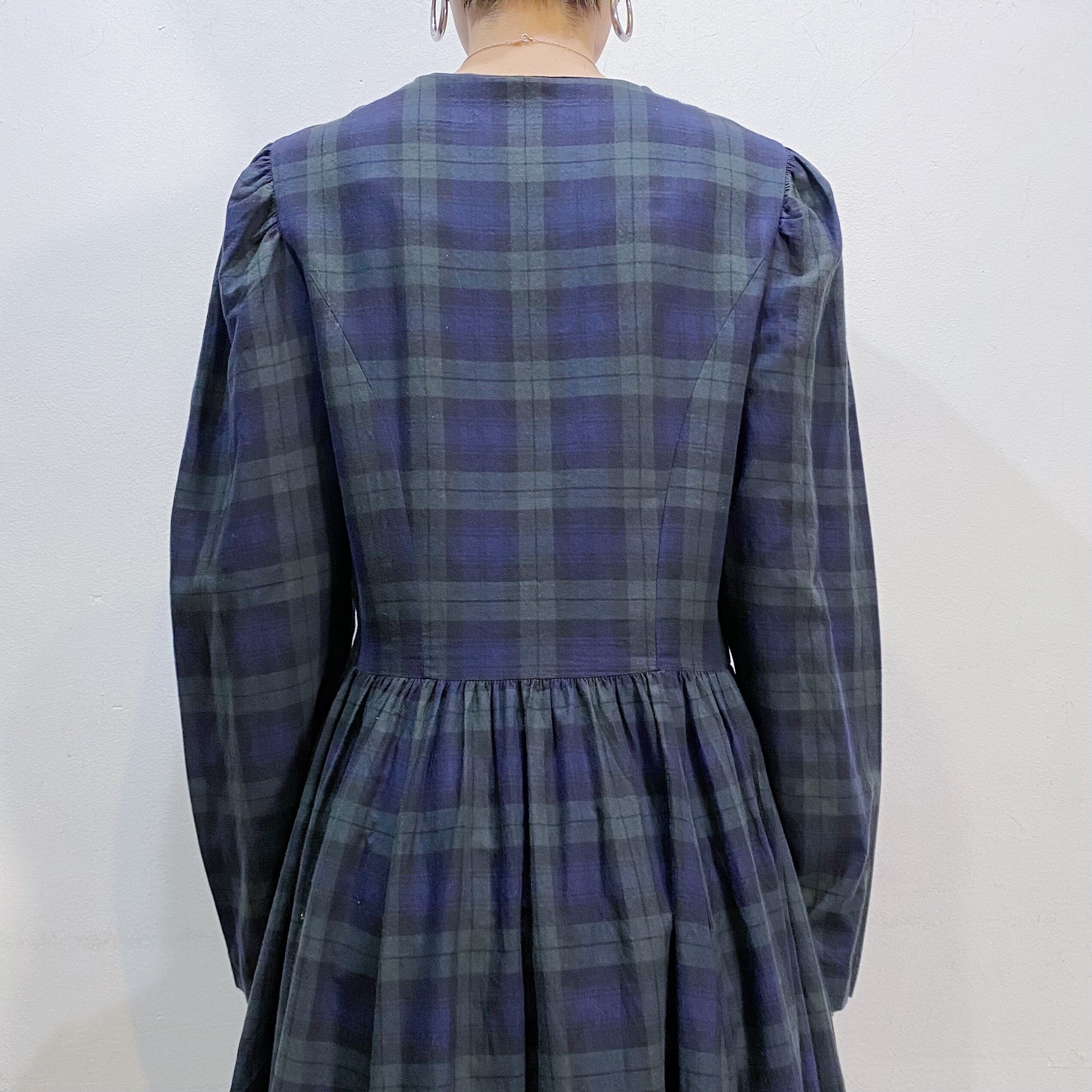 グリーン×ネイビーのチェックで大人可愛く着られる、ローラアシュレイのワンピースです。