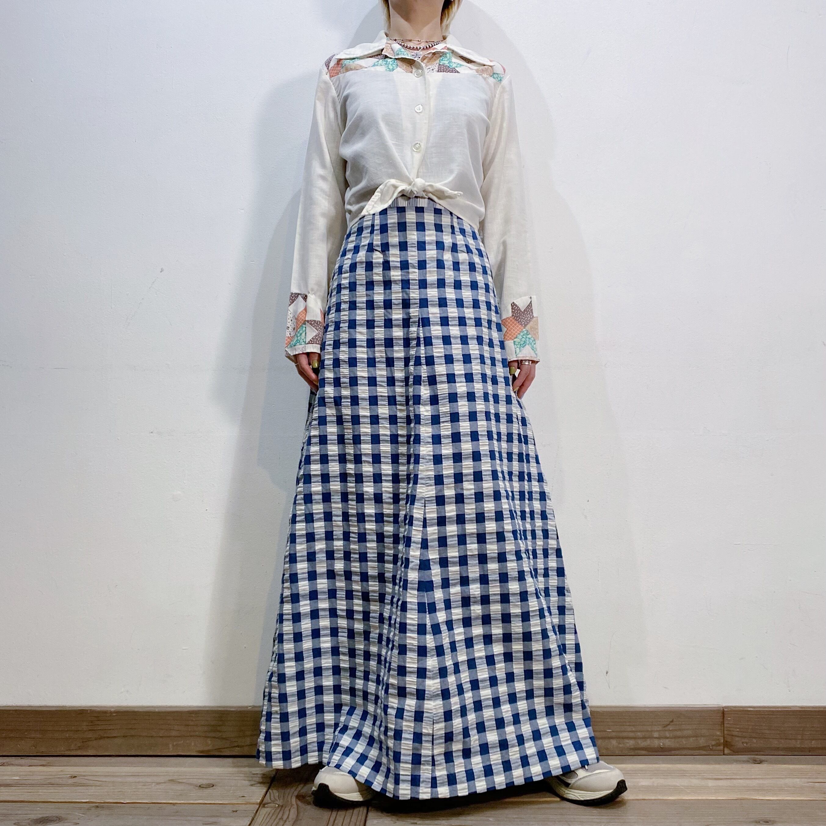 パッチワークプリントの中でも人気の星のようなモチーフが可愛い、70年代の長袖シャツです。