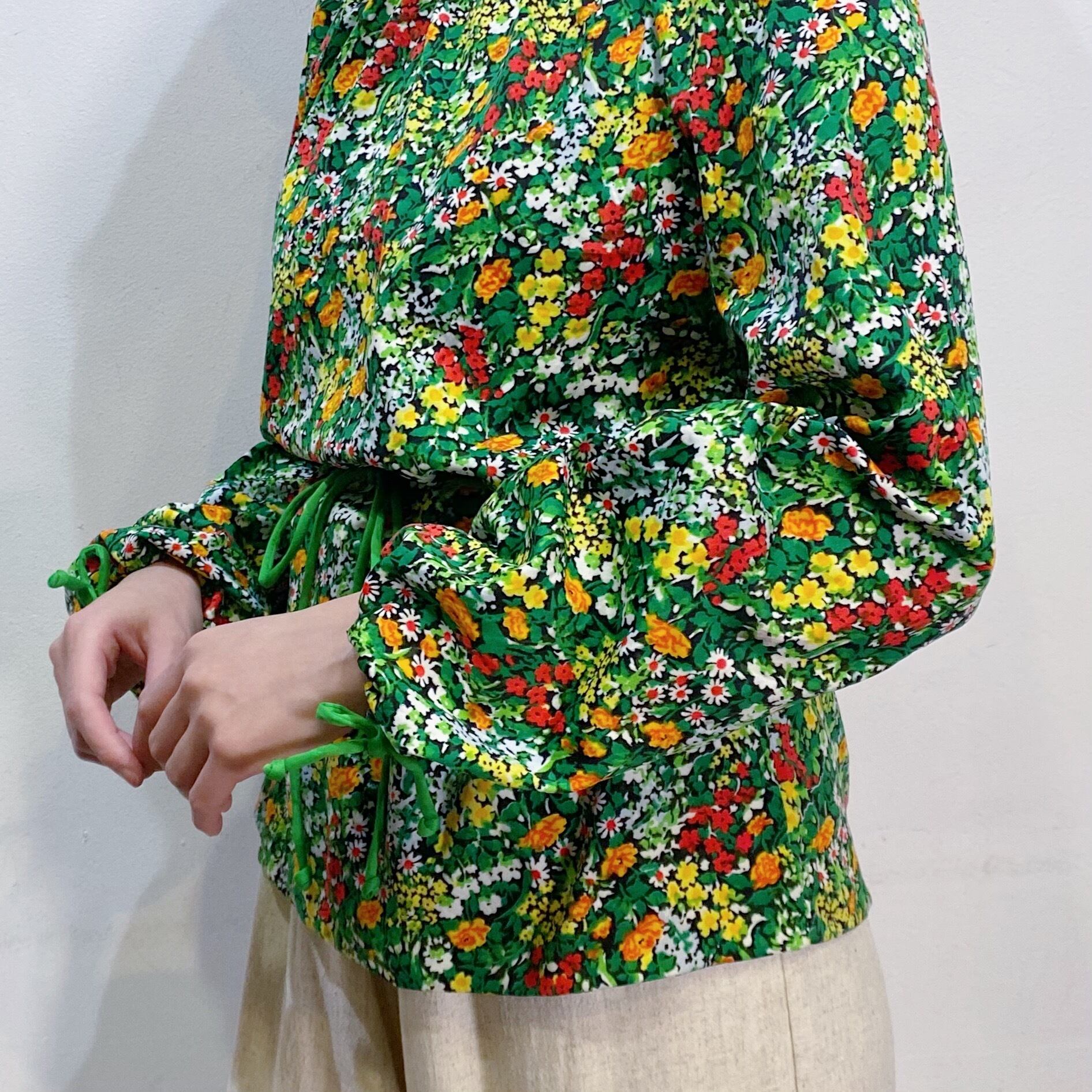 70s green flower printed long sleeves tunic