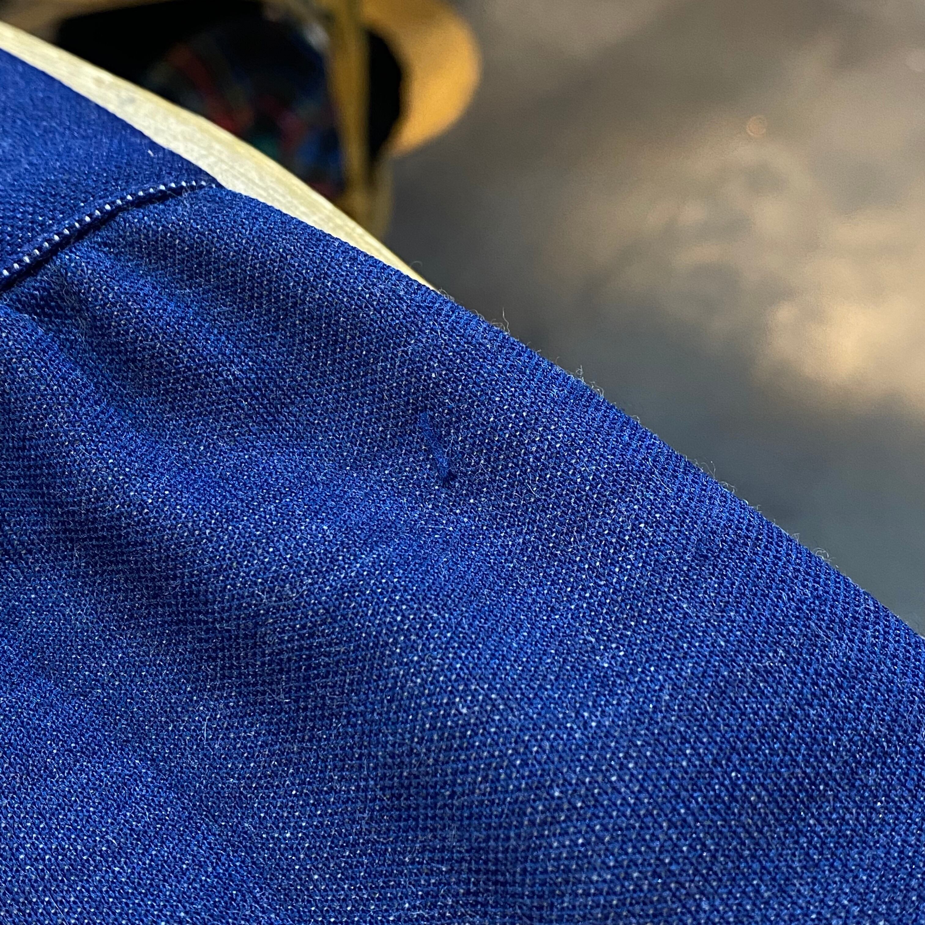 デニムではなくデニム風の、濃い青のポリエステル地で着やすい一枚。